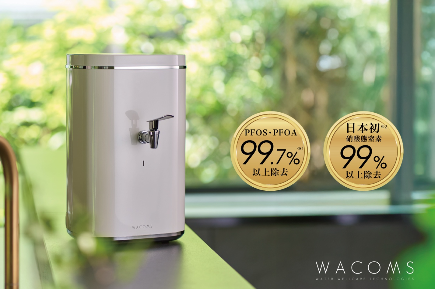 当社では、飲用水の安全性に対するニーズの高まりを受け、独自フィルター技術を搭載した高性能浄水器「WACOMS」を開発しました。WACOMSは、第三者機関により PFAS(PFOS・PFOA)を99.7%(*1)以上、そして日本初・硝酸態窒素を99%(*2)以上除去することが確認されています。
