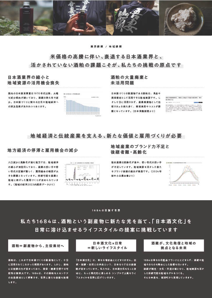株式会社1684は、岩手県紫波町の酒蔵「吾妻嶺酒造店」の酒粕をアップサイクルし、スキンケアアイテムとして新たな価値を届けるブランドです。