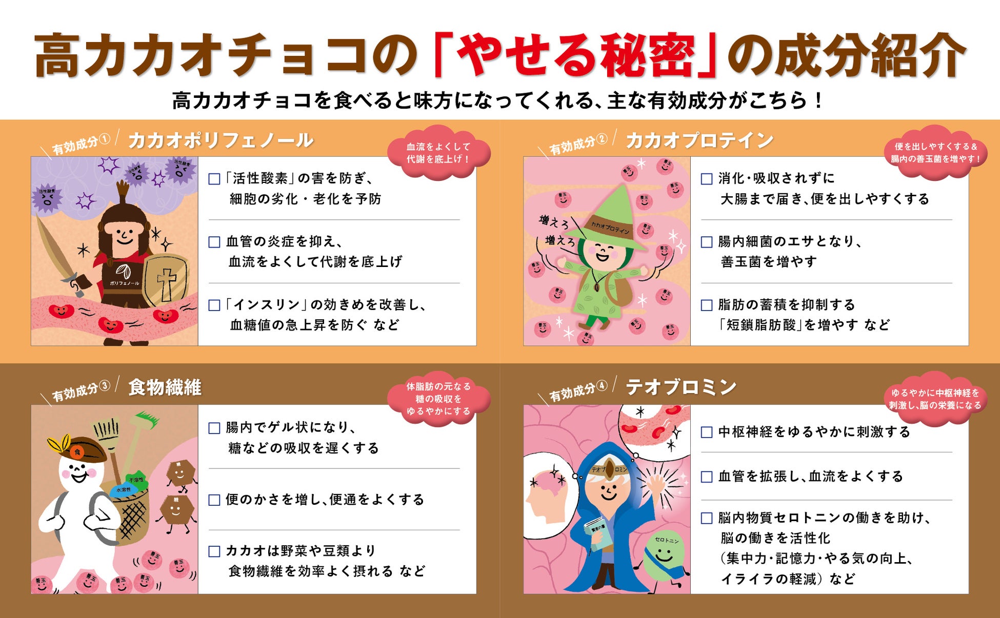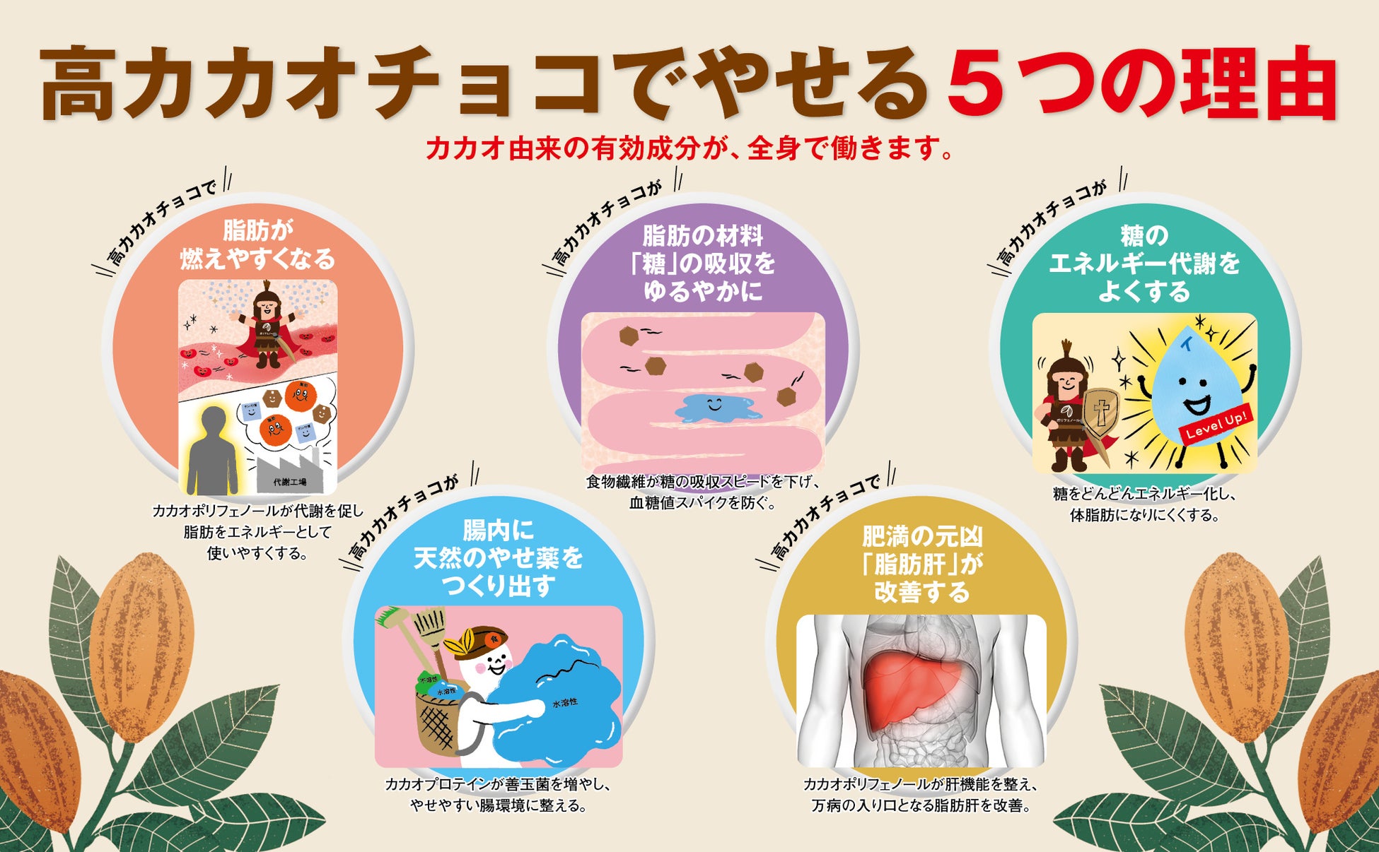 そのメカニズムを科学的な視点からやさしく解説します。カカオに含まれる主要な成分――ポリフェノール、カカオプロテイン、テオブロミン、リグニンなどの食物繊維――が、体内でどのように働くのかをていねいに紹介。研究データや専門家の見解を交えながら、日常生活に無理なく取り入れるための知識とコツをまとめました。