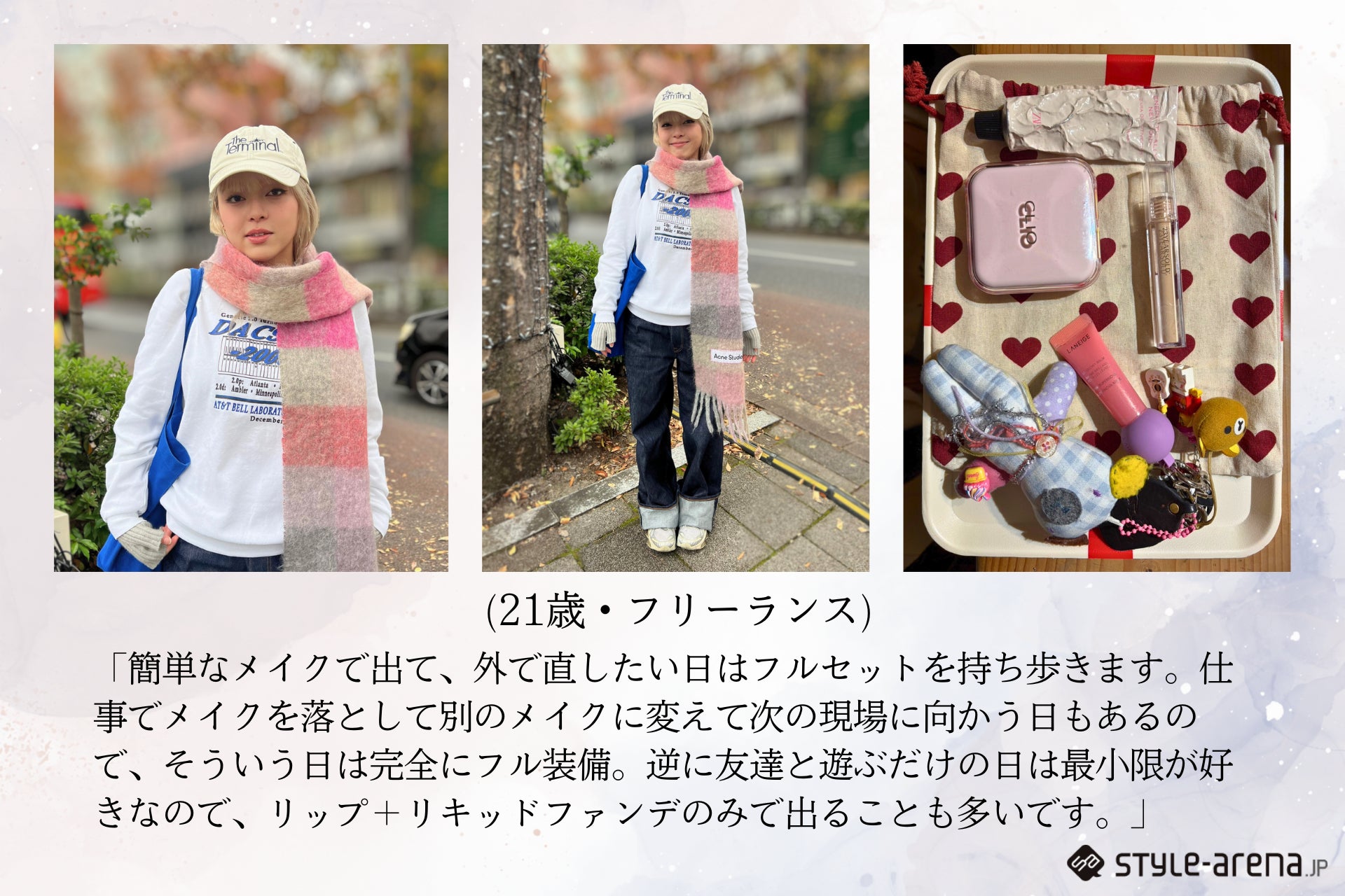 たとえば、21歳・フリーランスの人は「予定が多い日はフルセット」と語る一方で、友人と過ごす日は 「最低限で十分」という基準で“持たない選択”をする。これは単なる気分ではなく、“その日の自分”に合わせて最適化しています。