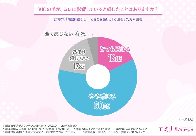 実際に「VIOの毛が、ムレに影響していると感じたことはありますか?」と質問したところ、約8割が『とても感じる(18.0%)』『やや感じる(60.0%)』と回答しました。