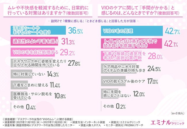 「ムレや不快感を軽減するために、日常的に行っている対策はありますか?(複数回答可)」と質問したところ、『汗取りシートやおりものシートを使う(36.5%)』と回答した方が最も多く、次いで『通気性のよい下着を選ぶ(31.3%)』『VIOの毛を自己処理する(29.2%)』となりました。