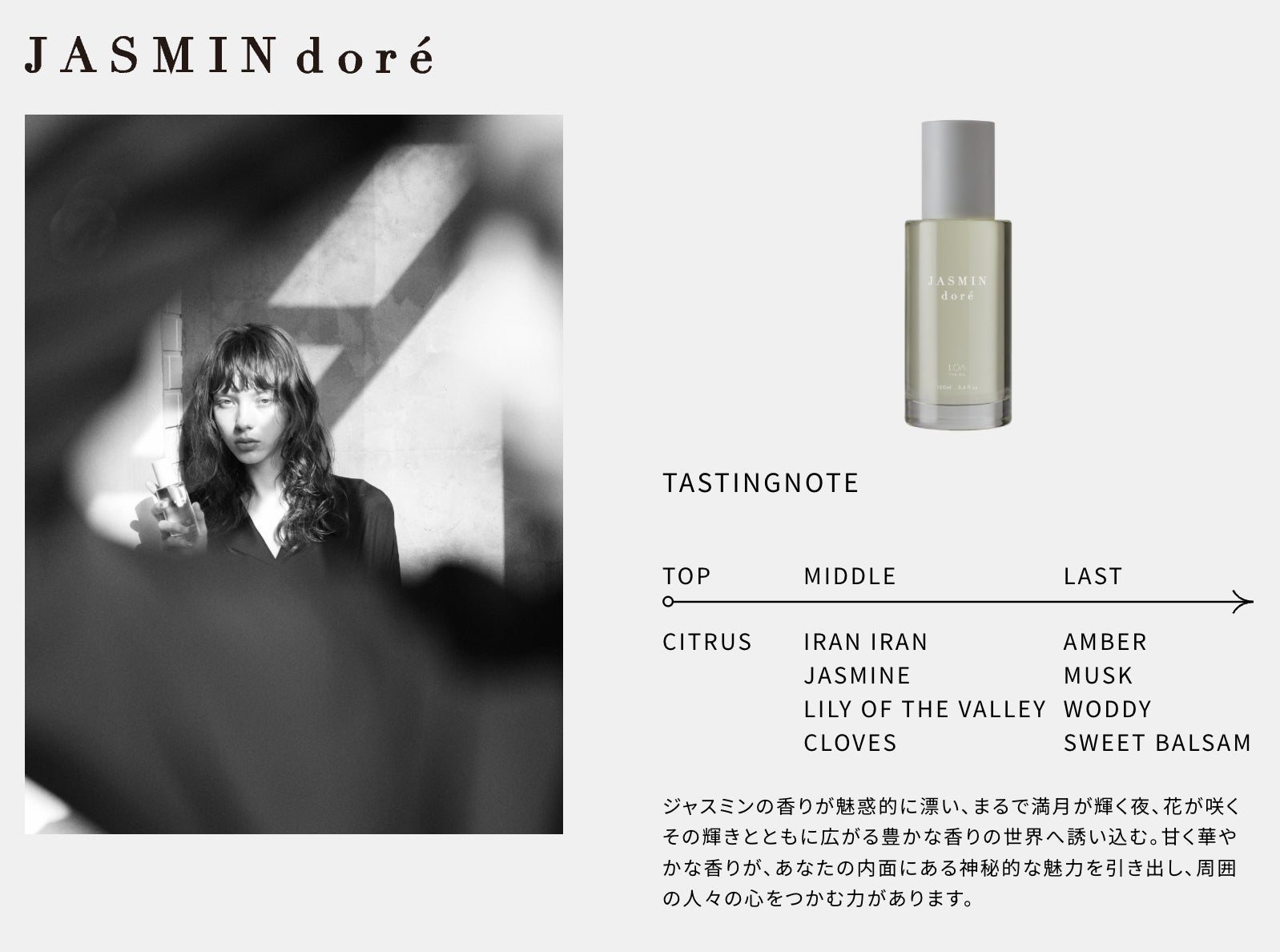 ジャスミンの豊かな香りが、夜に咲く花のように魅惑的に広がります。