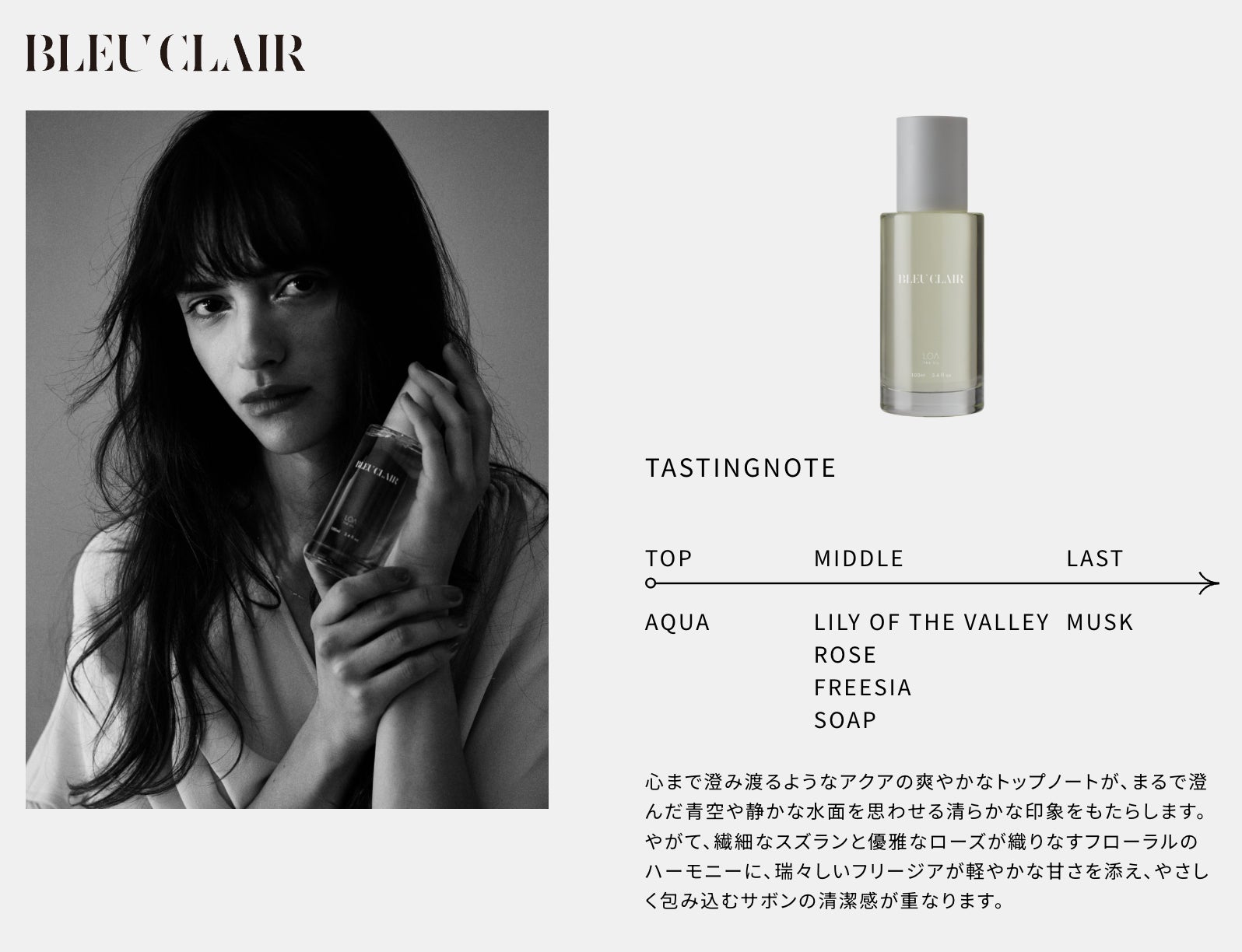 ラストではムスクとパチョリが穏やかな温もりを添え、透明感のある上品な余韻を静かに残します。