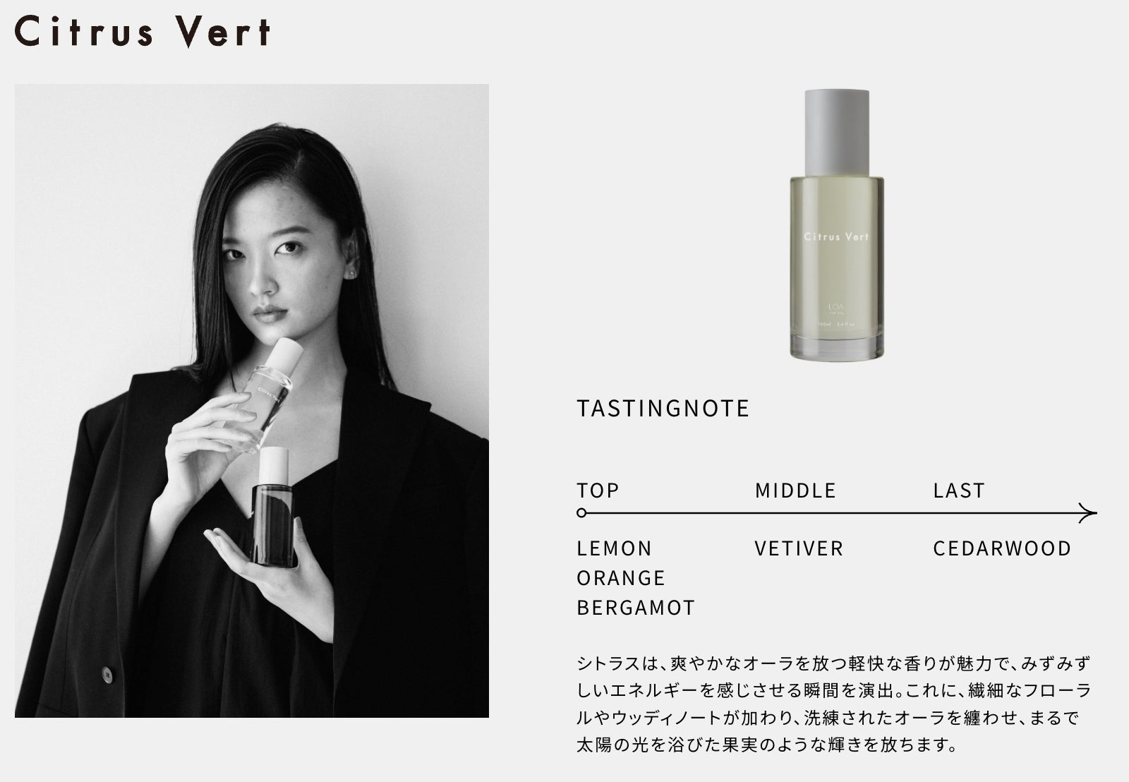 みずみずしいシトラスの輝きが瞬時に広がり、軽快で明るいエネルギーを纏わせる爽やかな香り。