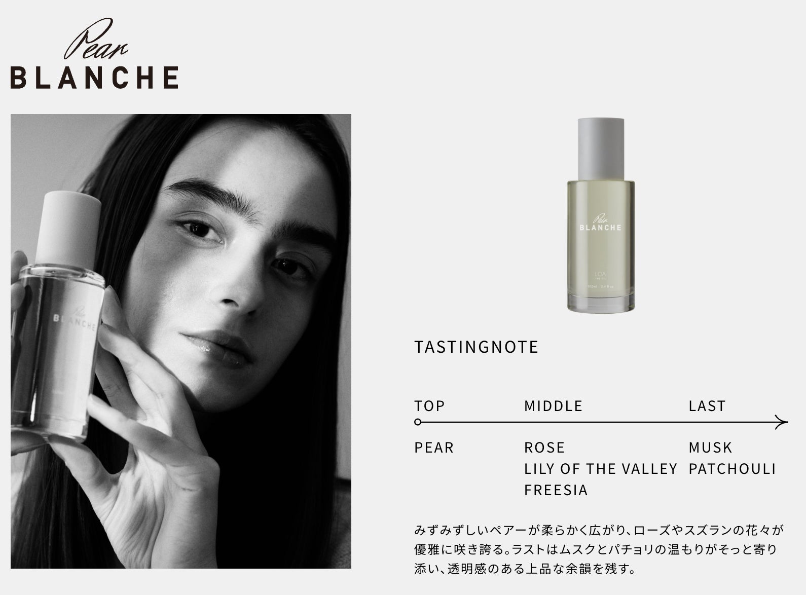 柔らかく広がるみずみずしいペアーに、ローズやスズランの花々が優雅に寄り添う軽やかな香り。
