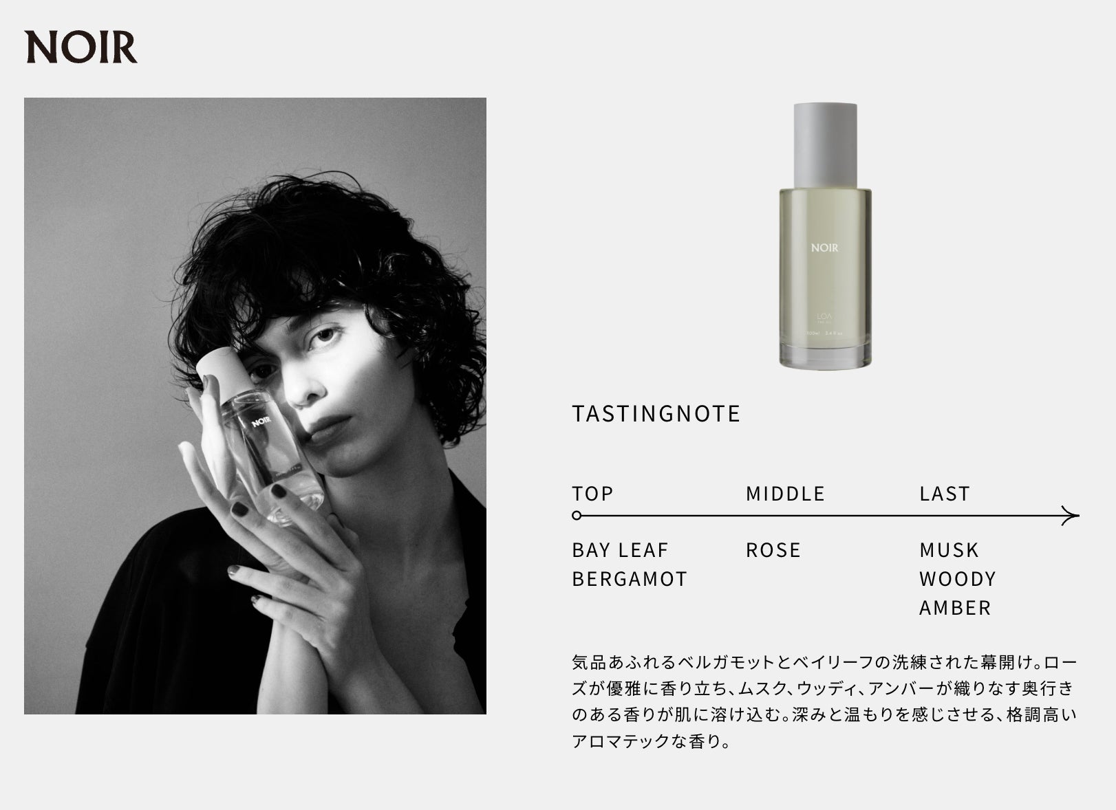 ローズの優雅な広がりに続き、ムスク・ウッディ・アンバーが溶け合い、深みと温もりを帯びた余韻が静かに肌へ溶け込む。