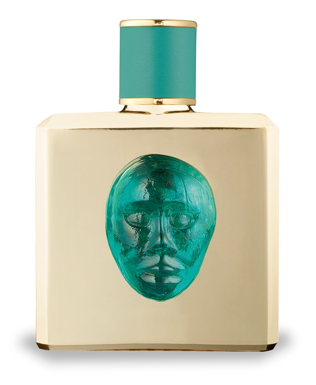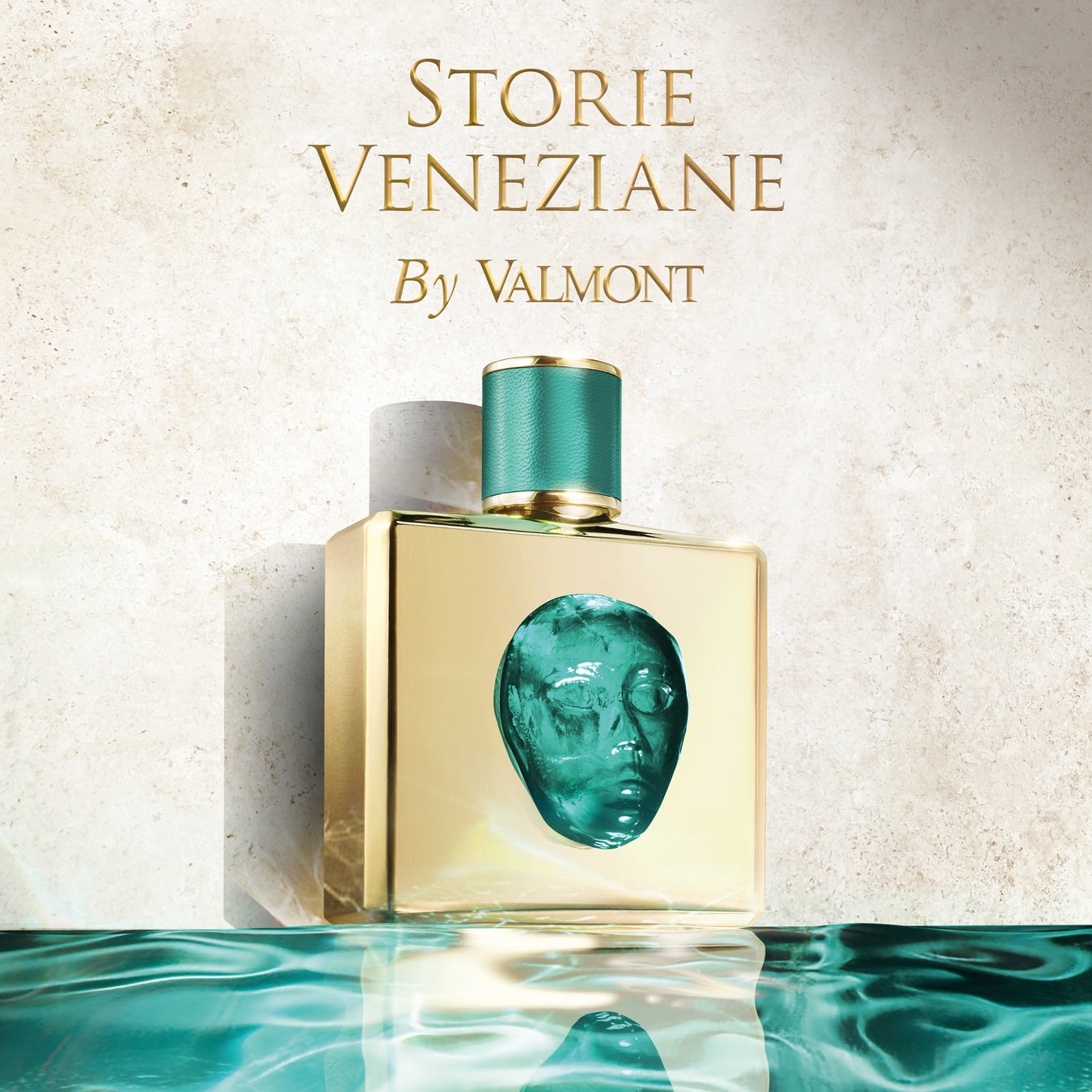 ストーリエ ヴェネツィアーネ コレクションを象徴するボトルは、金色に装われた彫刻のように堂々と佇み、熟練のガラス職人レオナルド・チモリンによるムラーノガラスのマスクで彩られています。その深みのある鮮やかなセラドンカラーは、生命力あふれるラグーンの揺らめきと、その原動力を想起させます。