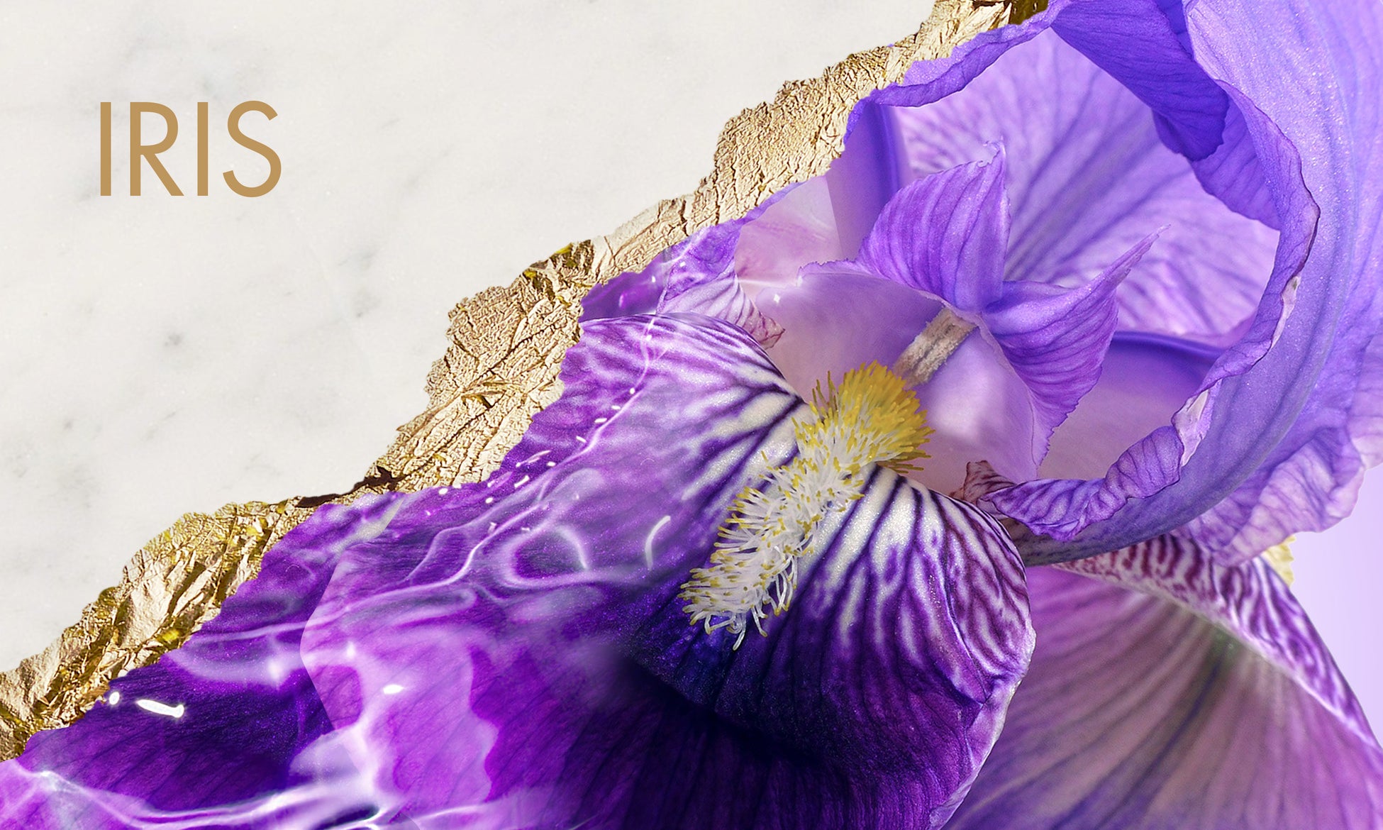 アイリス:高貴でパウダリー。中心に紫のニュアンスとウッディな響きを添え、優雅な強さを徐々に際立たせる。