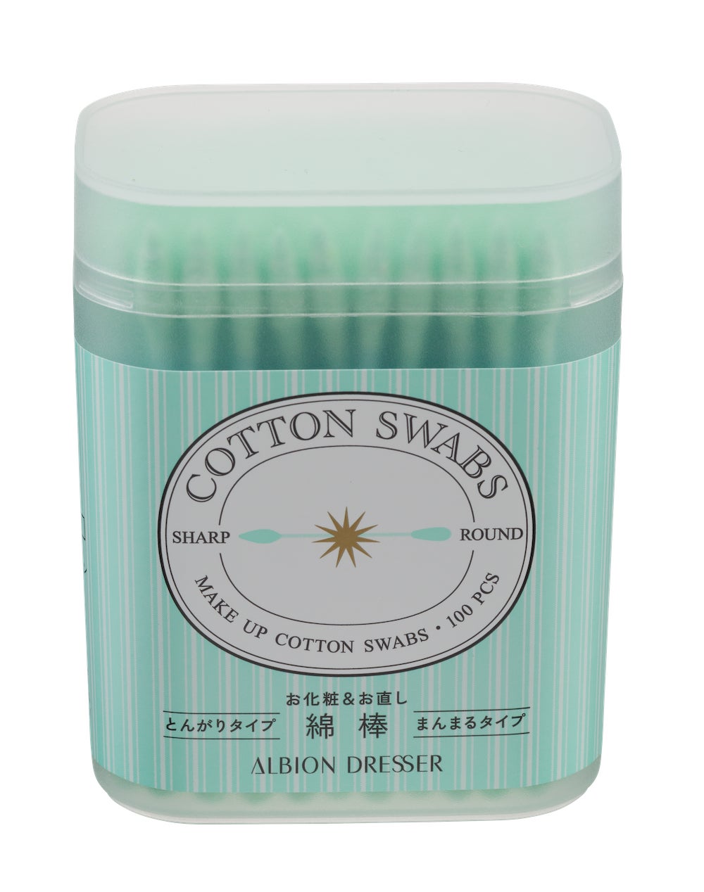 アイラインやリップなどの細かいメイク直しにおすすめのミントグリーンの綿棒。「筆先型」と「丸型」の組み合わせ。目のキワや目尻など、一般の丸い綿棒ではお直ししにくい細かなメイク直しにぴったり。パッケージと綿棒本体に、アルビオン ドレッサー オリジナルカラーをあしらい、メイク直しの時間も気分が上がるアイテムです。