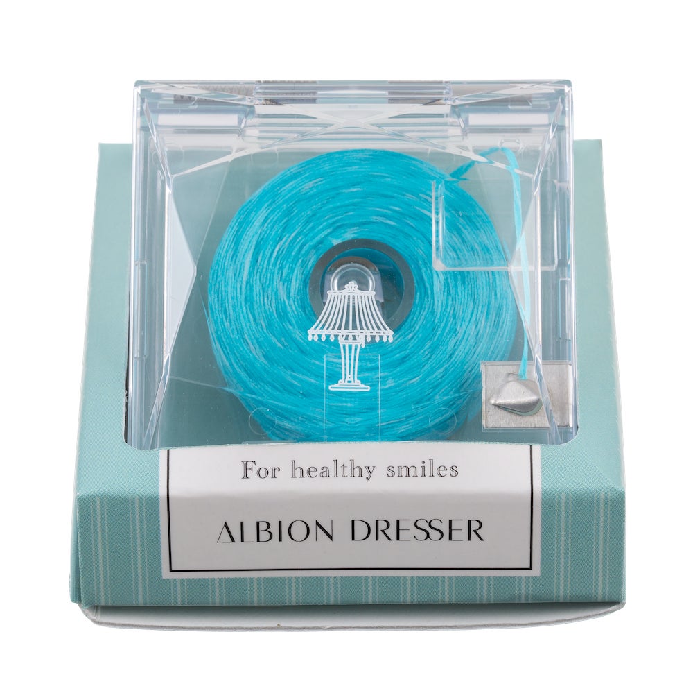 中央にアルビオン ドレッサーの象徴であるランプ柄をあしらい、まるでコスメのようなデンタルフロス。384本の繊維がふわっと広がり、ワックスコーティングにより歯間に滑り込みやすく、やさしく汚れを絡めとります。フッ素、キシリトール配合でマイルドミントのフレーバーが毎日の口内ケアを爽やかにしてくれます。