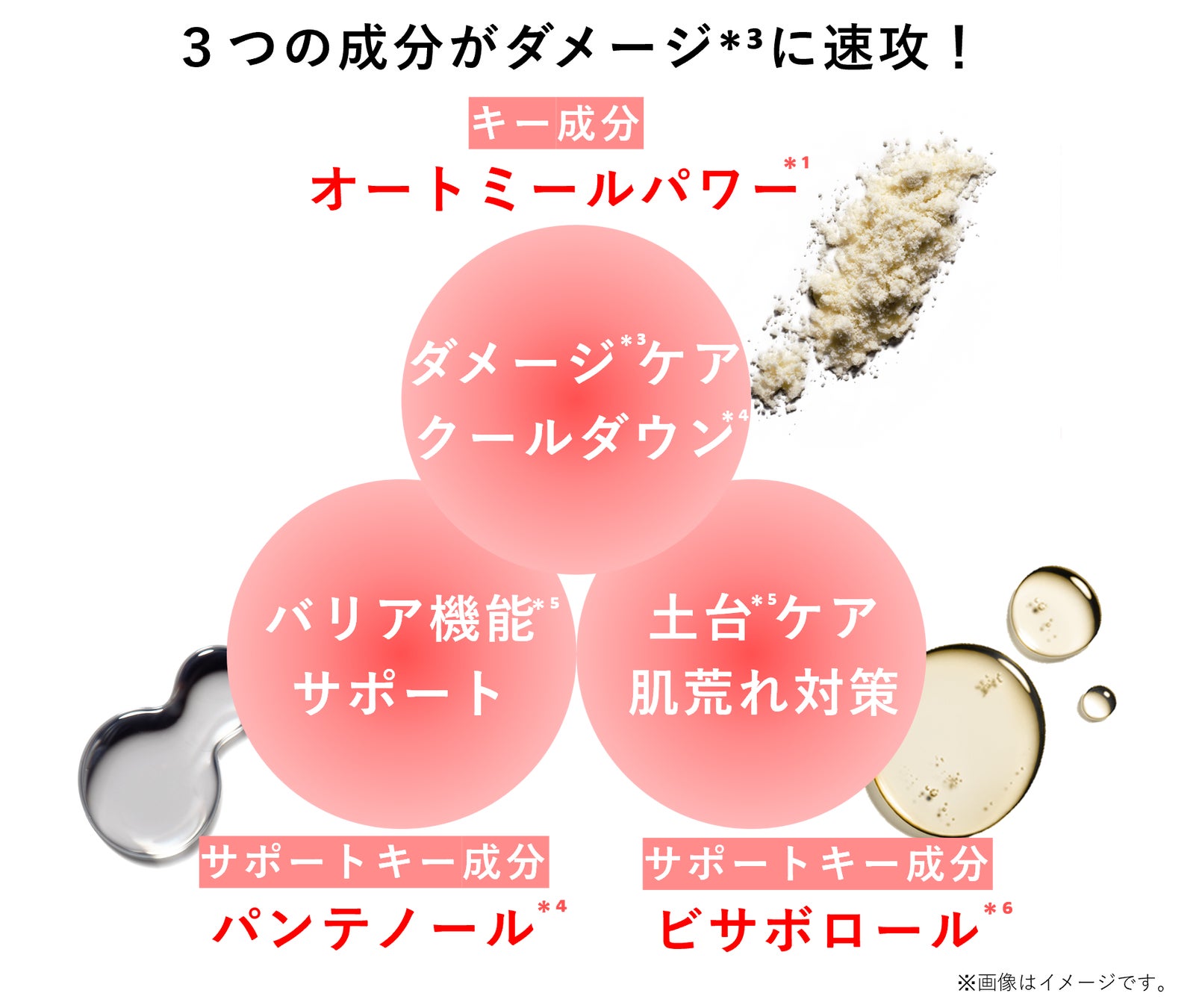 「ダメージ保護」として2003年にアメリカで認められた美容成分として注目されている。数多くの美容成分が含まれており、クールダウン*²や肌のバランスを整えるなど、肌を健やかに立て直す多角的なダメージ*³ケアと保湿ケアの両立が期待されています。