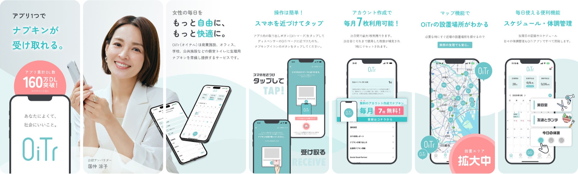 OiTrは、日本で初めて、全国の商業施設や公共施設などの女性個室トイレに生理用ナプキンを常備・無料提供するサービスです。専用アプリに登録すれば、2時間に1枚、最大25日間で7枚までナプキンを無料で受け取ることができます。2025年11月時点で、全国32都道府県・347施設に合計3,697台を設置しています。詳細:https://www.oitr.jp/spot/
