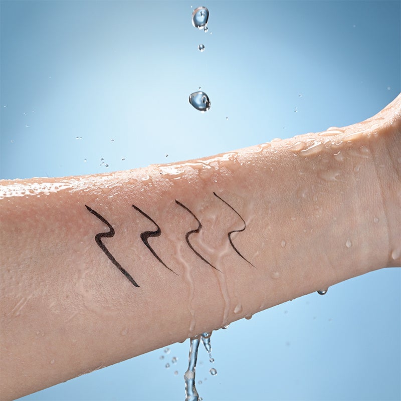 落ちにくさにこだわり、汗・水・涙に強いウォータープルーフとなっています。肌に描いた後は非常に早く乾くため、アイラインを引いたあとすぐにビューラーなど次のメイクに移っていただけます。