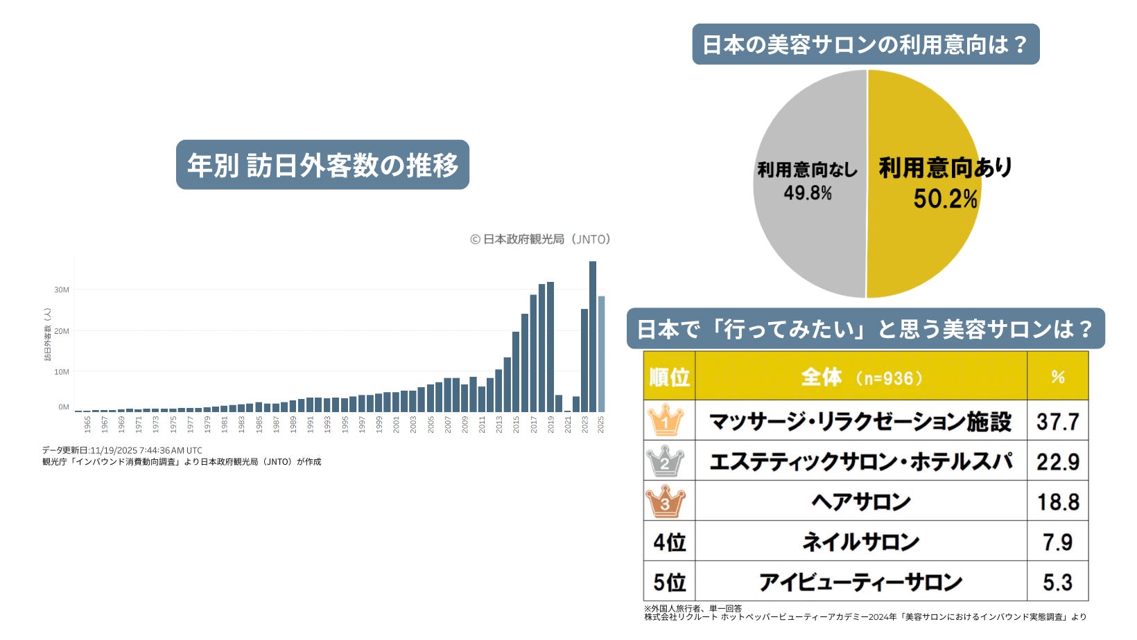 2024年9月に株式会社リクルートホットペッパービューティーアカデミーが実施した調査によると、訪日外国人の約37.7%が「マッサージ・リラクゼーションサービス施設を利用したい」と回答しており、日本滞在中の「癒しニーズ」は確実に存在しています。