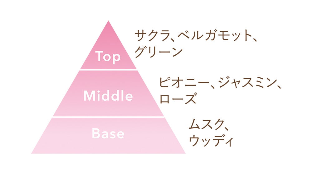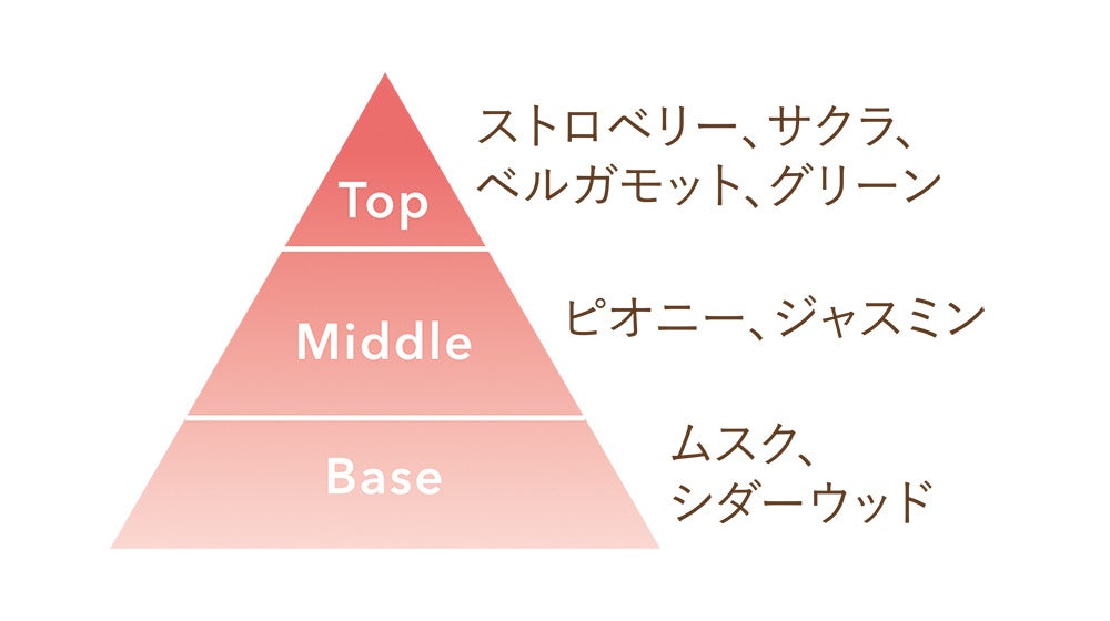 可憐に春めくサクラに甘酸っぱいイチゴの香りをプラスした、みずみずしいフルーティフローラルの香りです。