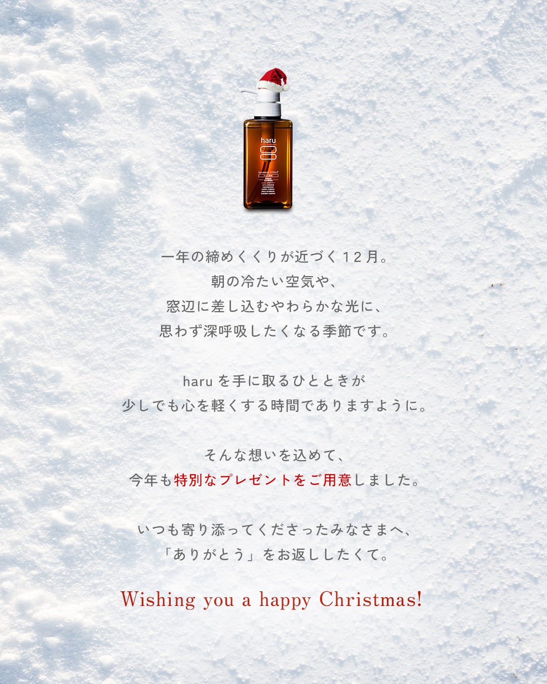 年末の気配が近づく12月、ヘッドビューティブランド「haru」(株式会社nijito/本社:東京都港区、EC事業部:福岡市中央区)では、12月1日(月)より一年の感謝を込めて、クリスマスシーズンを彩るプレゼントキャンペーンを公式Instagramで開催いたします。公式アカウント(@haru_tennen100)をフォロー&いいねをいただいた方から、抽選で20名様に『kurokamiスカルプ』の3種セットをお届けいたします。