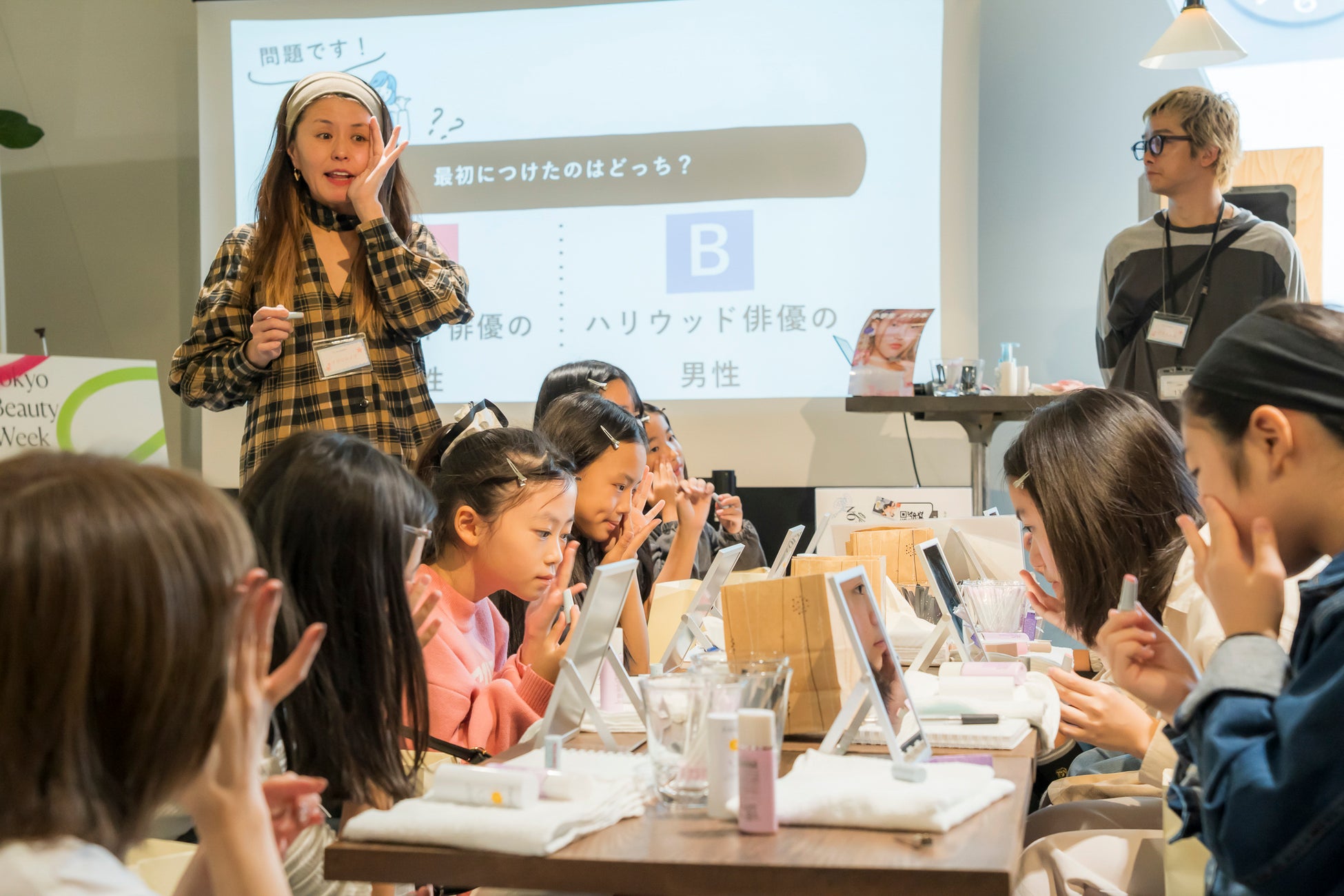 今回のイベントには、小学3年生~中学3年生の子どもたちが参加。Tokyo Beauty Weekのテーマでもある”自分なりの美””自分らしさ”の表現をテーマに、ビューティークリエイターパートナーズでもあるイガリシノブさんによる、クイズやゲームを交えながら楽しいレクチャーのもと、スキンケアからメイクアップまでを自分の手で仕上げる体験に挑戦。