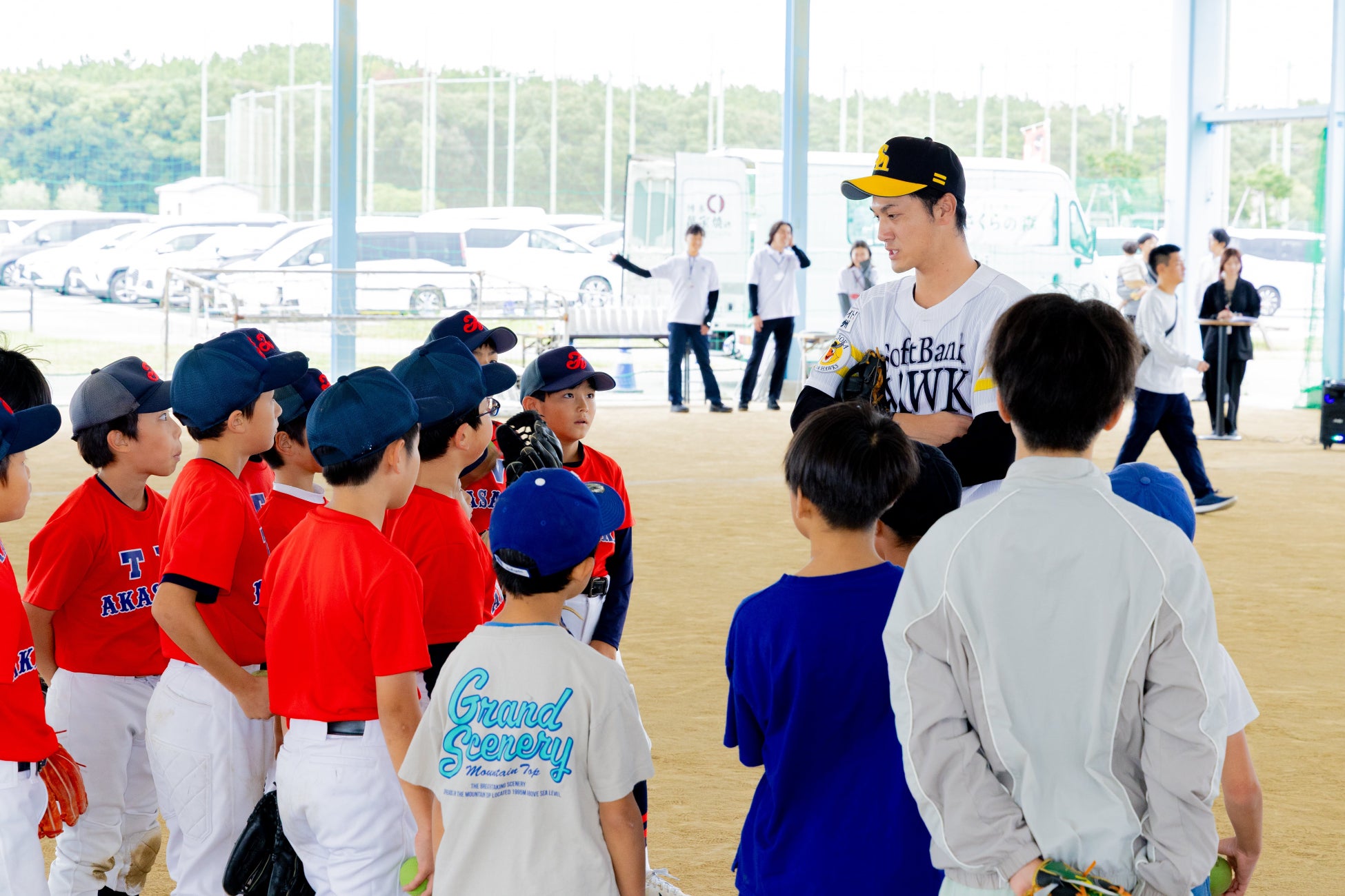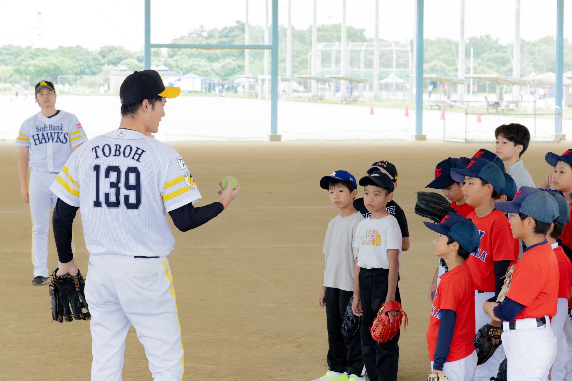 当日は、福岡ソフトバンクホークスOBであり、現在ホークスジュニアアカデミーのコーチとして活躍中の髙橋純平さんと東方伸友さんを特別講師に迎え、抽選で選ばれた20名の小学3~6年生が参加しました。