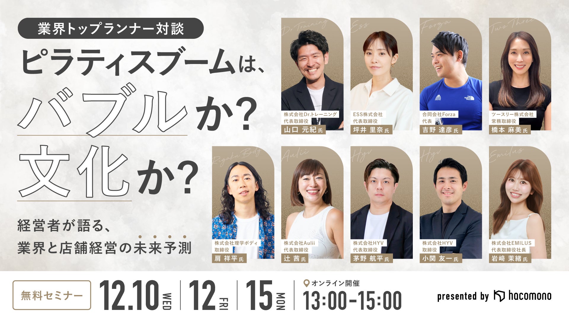 ウェルネス/運動施設向けオールインワン・マネジメントシステム「hacomono」を提供する株式会社hacomono(本社:東京都渋谷区、代表取締役CEO:蓮田健一)は、日本のピラティスシーンを最前線で牽引する8社の経営者をお招きし、マシンピラティス市場の未来を問うオンラインイベント「ピラティスブームは、バブルか?文化か?」を2025年12月10日(水)、12日(金)、15日(月)に開催いたします。
