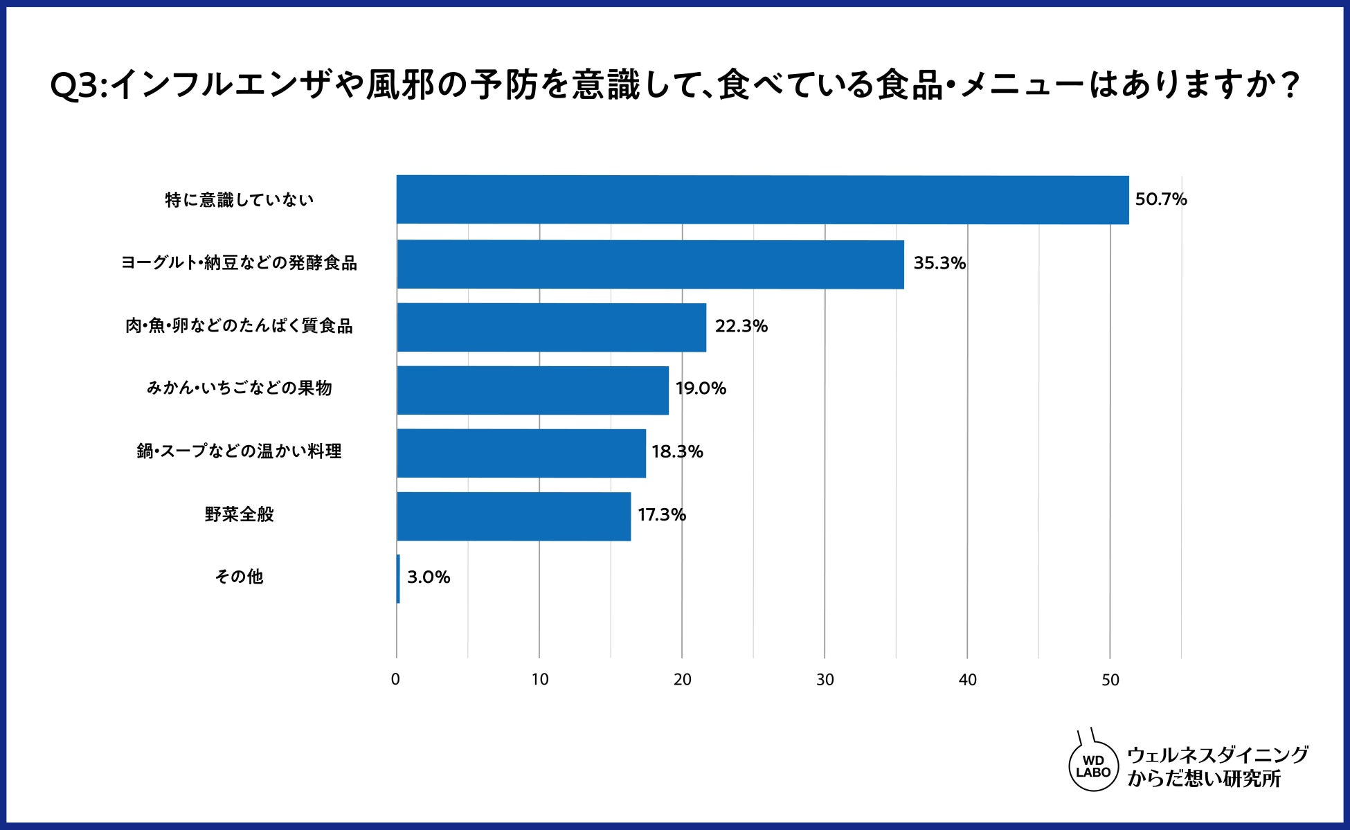 Q3:インフルエンザや風邪の予防を意識して、食べている食品・メニューはありますか?(複数回答)