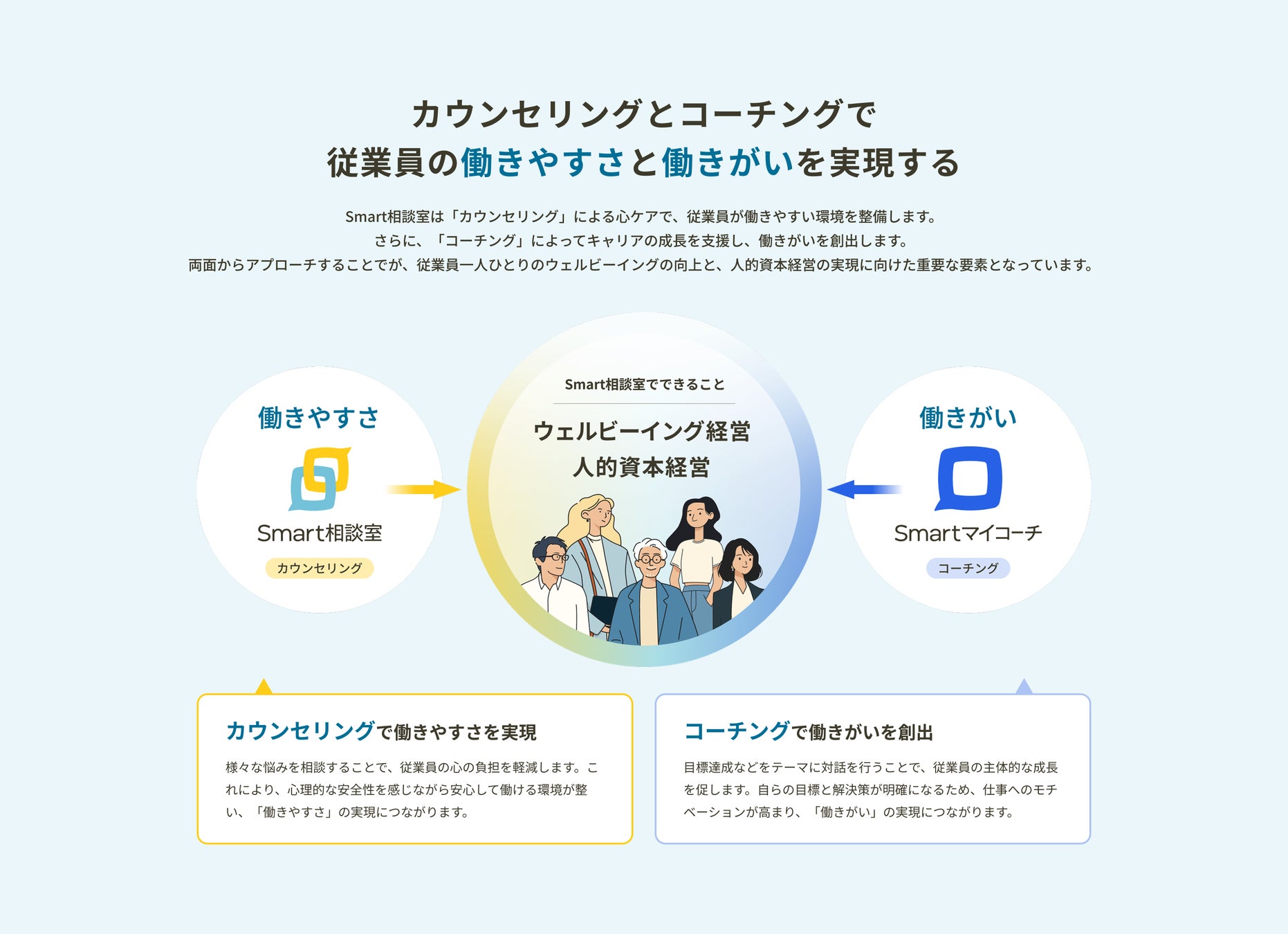 さらに、今回のリニューアルでは、マルチプロダクトとしての全体像と提供価値を整理し、その関係性を明確にしました。「Smart相談室」は“働きやすさ”を支え、「Smartマイコーチ」は“働きがい”を育むという役割を示すとともに、それぞれが「ウェルビーイング経営」や「人的資本経営」へとつながるということを、視覚的にわかりやすく表現しています。