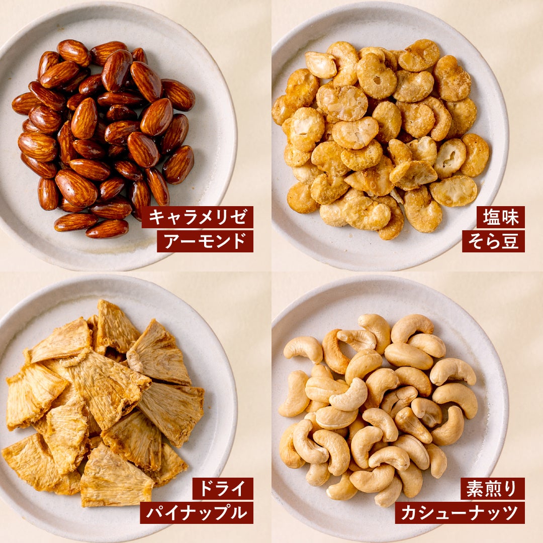 おやつとしての楽しさや満足感があり、なおかつ、体にも良いものを目指し、何度も試作を重ねました。まず軸としたのは、キャラメリゼアーモンドと塩味そら豆です。この2つを中心に甘味・塩味のバランスや相性、保存性を細かく検証し、最適な組み合わせを探りました。その過程で、味わいに奥行きを持たせ、アーモンドとそら豆の良さを引き立てる素材として、ドライパイナップルと素煎りカシューナッツを加えることを決めました。