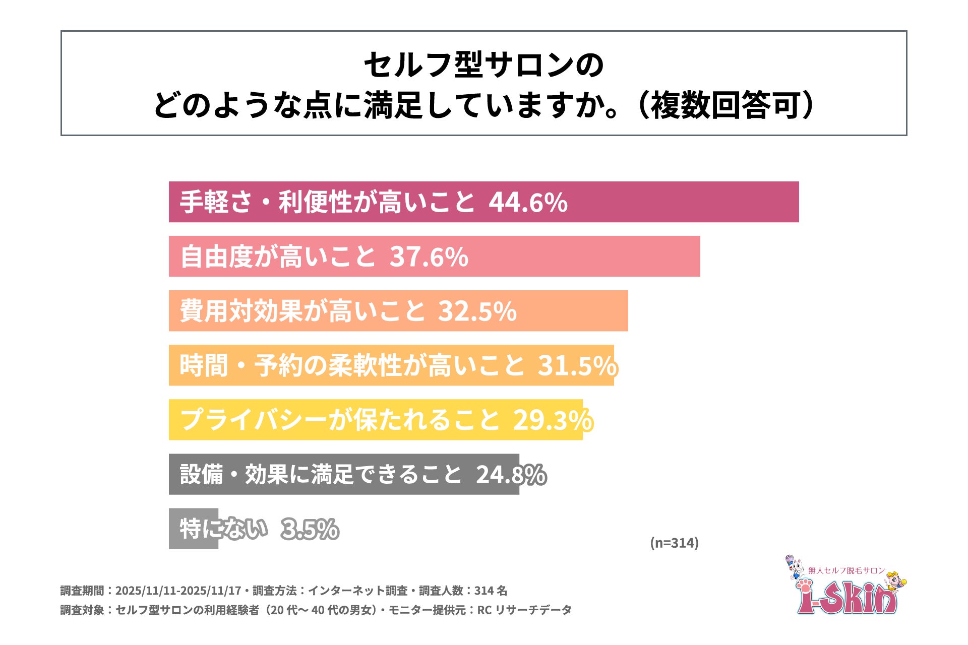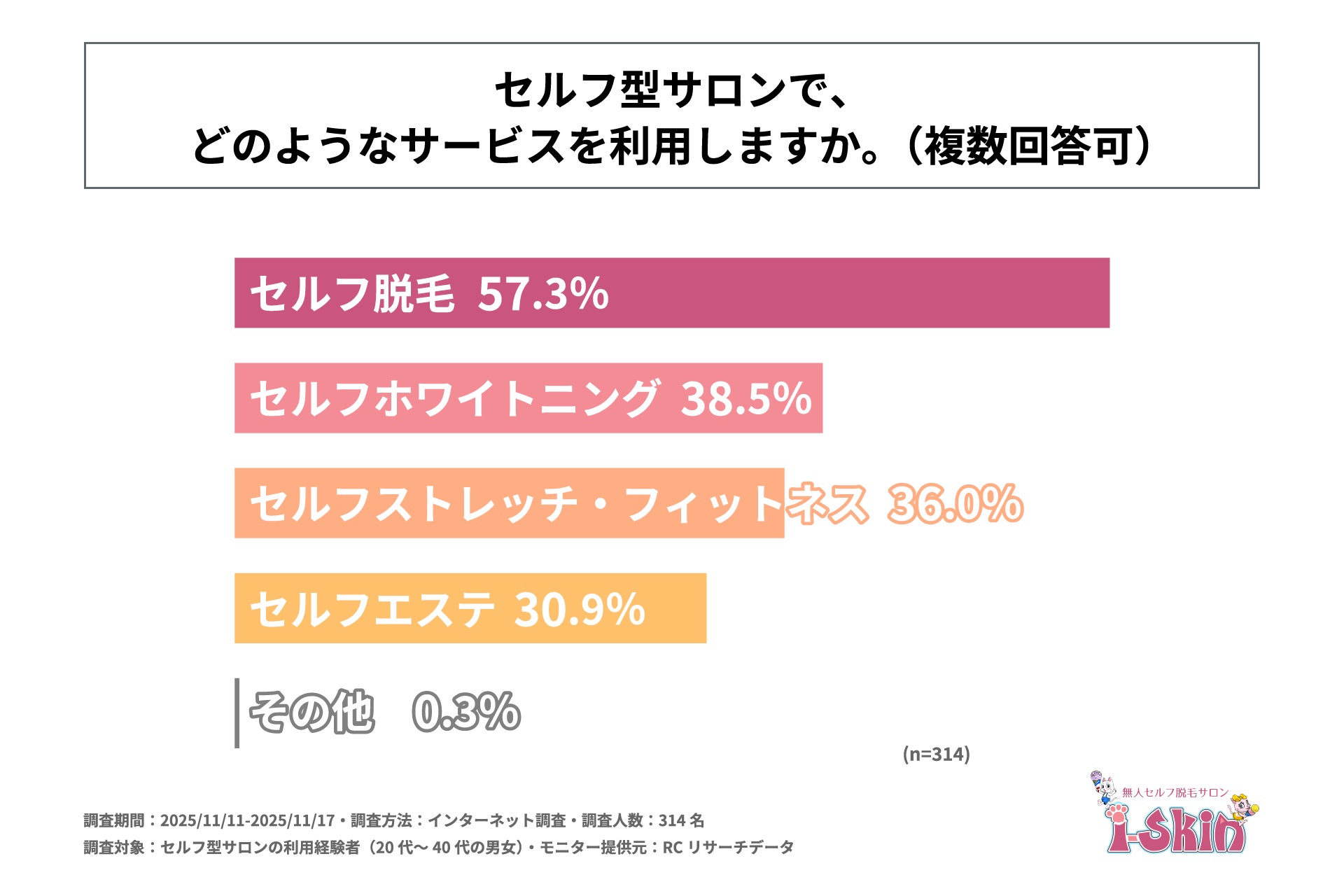 i-Skin合同会社(本社:東京都中央区、代表社員:石川 隼佑)が運営する「無人セルフ脱毛サロン i-Skin」は、セルフ型サロンの利用経験者(20代~40代の男女)を対象に「セルフ型サロンの利用実態に関する調査」を実施しました。この調査から、セルフ型サロンの利用経験者がセルフ型サロンを選ぶ理由、またセルフ型サロンに満足している点や不満な点などが明らかになりました。