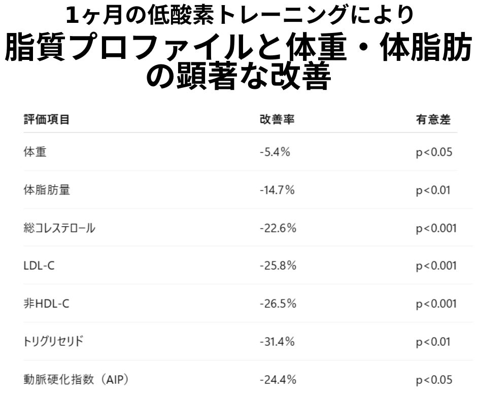 さらに、低酸素トレーニングは総コレステロール(-22.6%、p<0.001)、LDL-C(-25.8%、p<0.001)、非HDL-C(-26.5%、p<0.001)、およびトリグリセリド(-31.4%、p<0.01)の顕著な減少をもたらした。