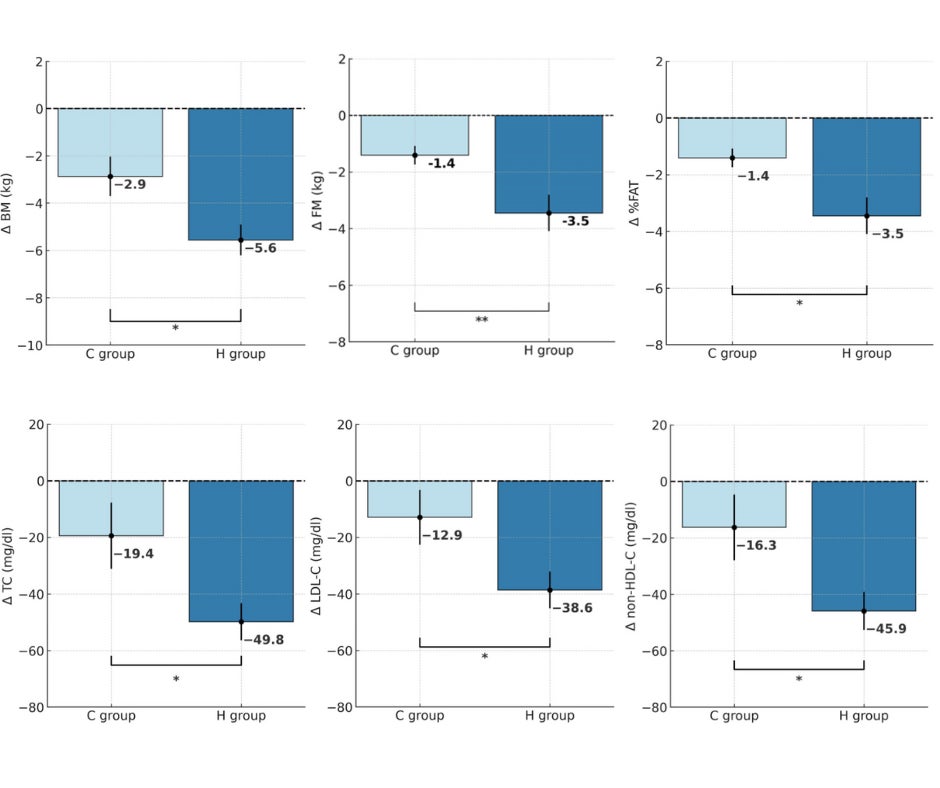 研究結果から、H群はC群と比較して、体重(-5.4% vs -2.6%、p<0.05)および体脂肪量(-14.7% vs -7%、p<0.01)において有意に大きな減少を達成した。