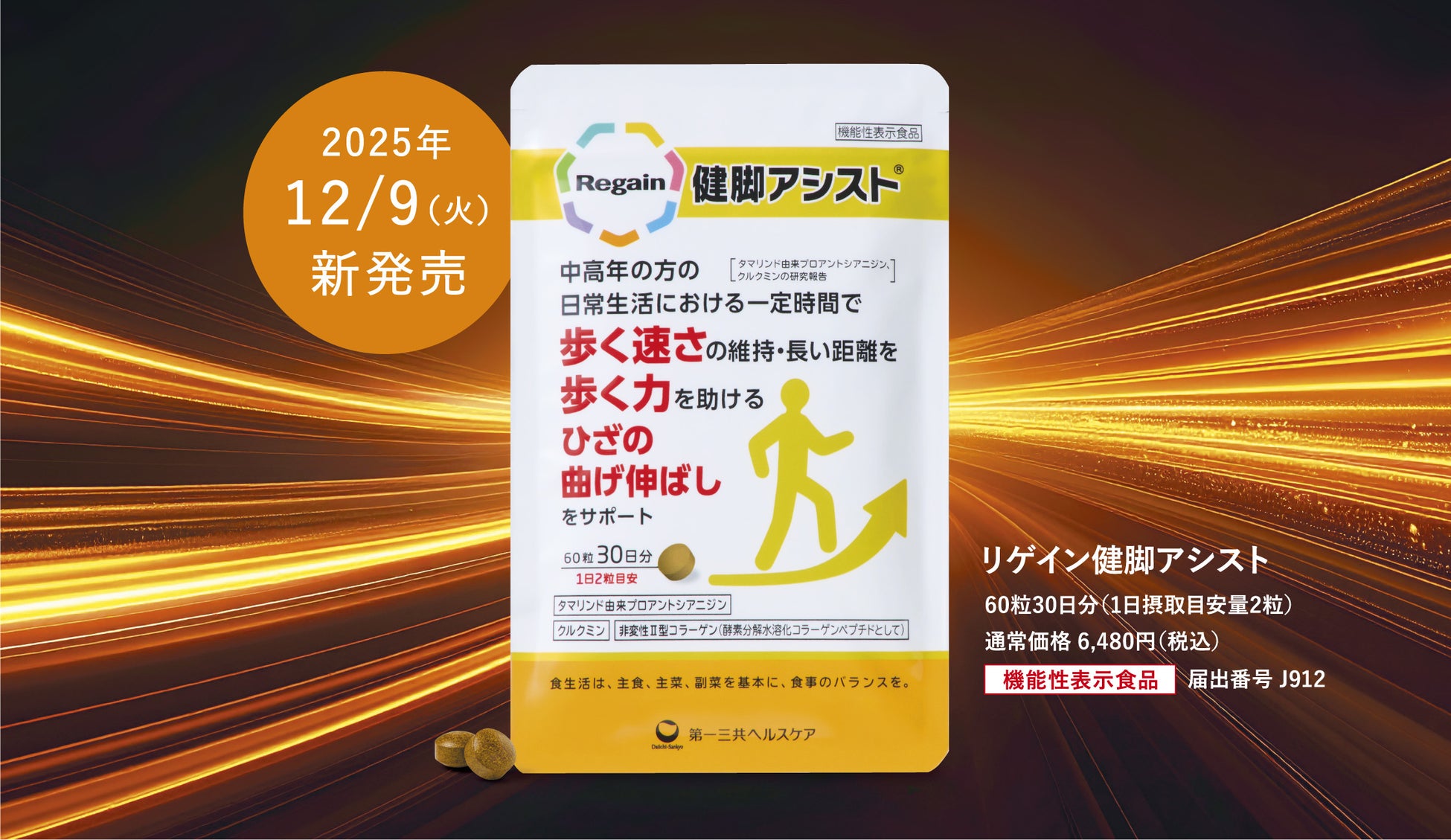 第一三共ヘルスケアダイレクト株式会社(本社:東京都中央区、社長:八重樫 宏志)は、リゲインブランドより「歩く力」「ひざ本来の力」をサポートする『リゲイン健脚アシスト』を、2025年12月9日(火)に発売いたします。健脚アシストは“歩くことが楽しい”と思える毎日を過ごしていただきたいという願いを込めて作られた商品です。厳選された原料を用いた日本初(※1)の独自配合により、一定時間で歩く速さの維持や長い距離を歩く力、階段の上り下りを助けます。