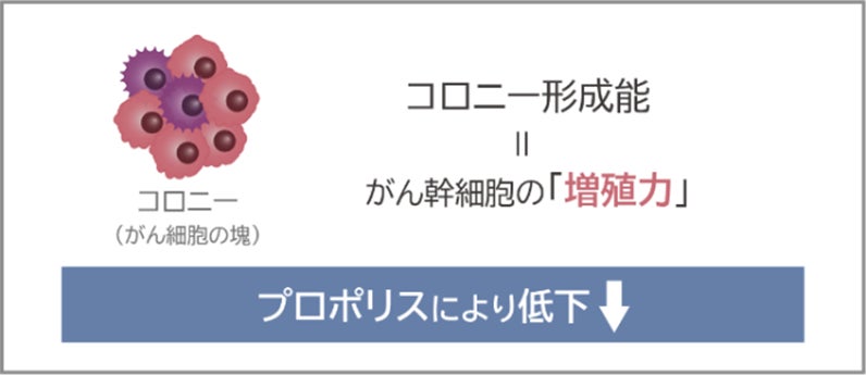 大腸がん細胞株由来のがん幹細胞に、プロポリスを添加した結果、プロポリスを添加していない条件と比べてコロニー形成が有意に低下した。このことから、プロポリスはがん幹細胞の増殖能を抑え、コロニー形成能を低下させることが示された。