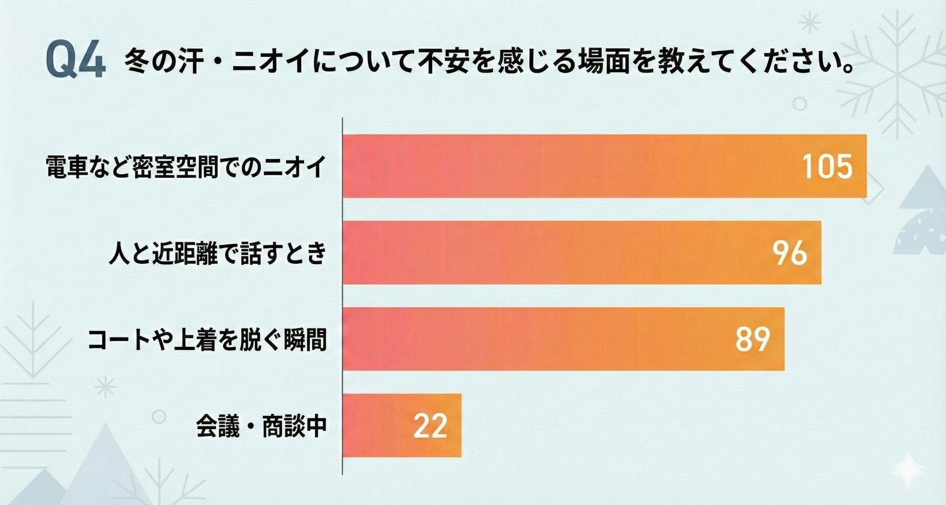 調査の結果、約37%が『冬に汗が止まらない経験あり』と回答し、最も汗をかきやすい場所には「電車内」が挙がりました。また、「冬でもニオイが気になる」「上着を脱ぐ瞬間が不安」という声も多く、冬特有の”暖房汗”が生活者のストレスになっている実態が明らかになりました。