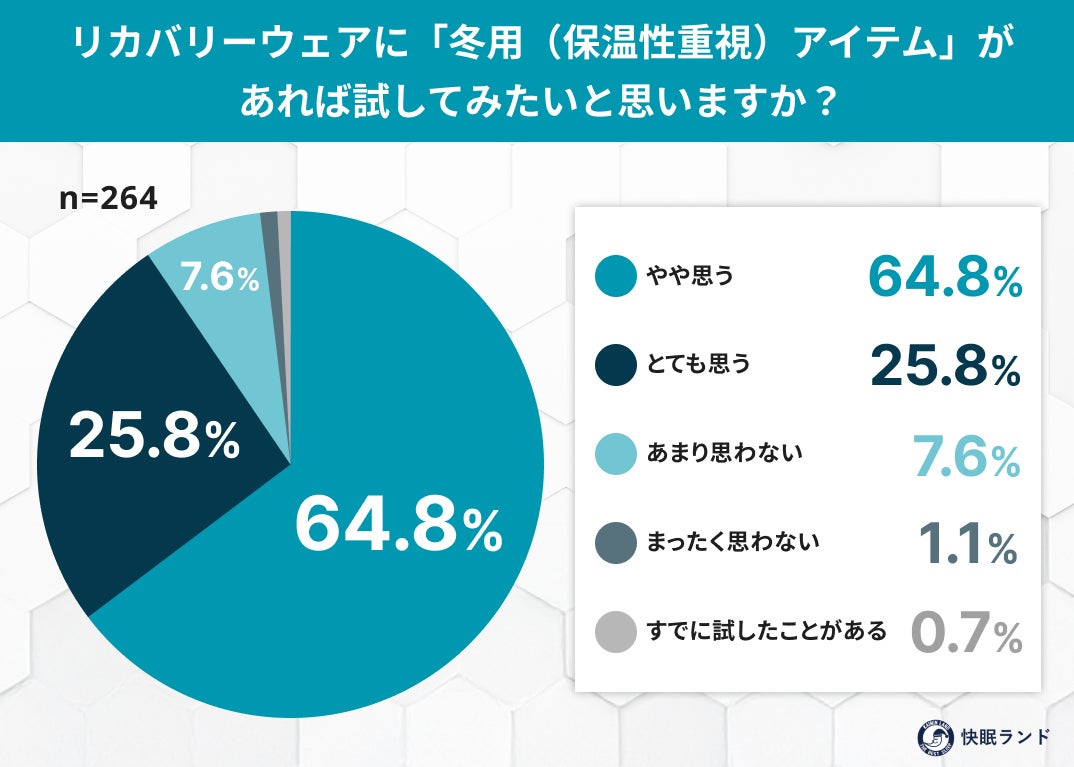 冬の睡眠環境は、体温調整のしづらさから睡眠の質を落としやすい時期でもあります。今回の調査では、リカバリーウェアに対して「温かさの向上」や「真冬でも快適に眠りたい」というニーズが強く確認されました。今後も快眠ランドでは、利用者の声をもとに“冬の睡眠課題を解決するアイテム”を提案してまいります。