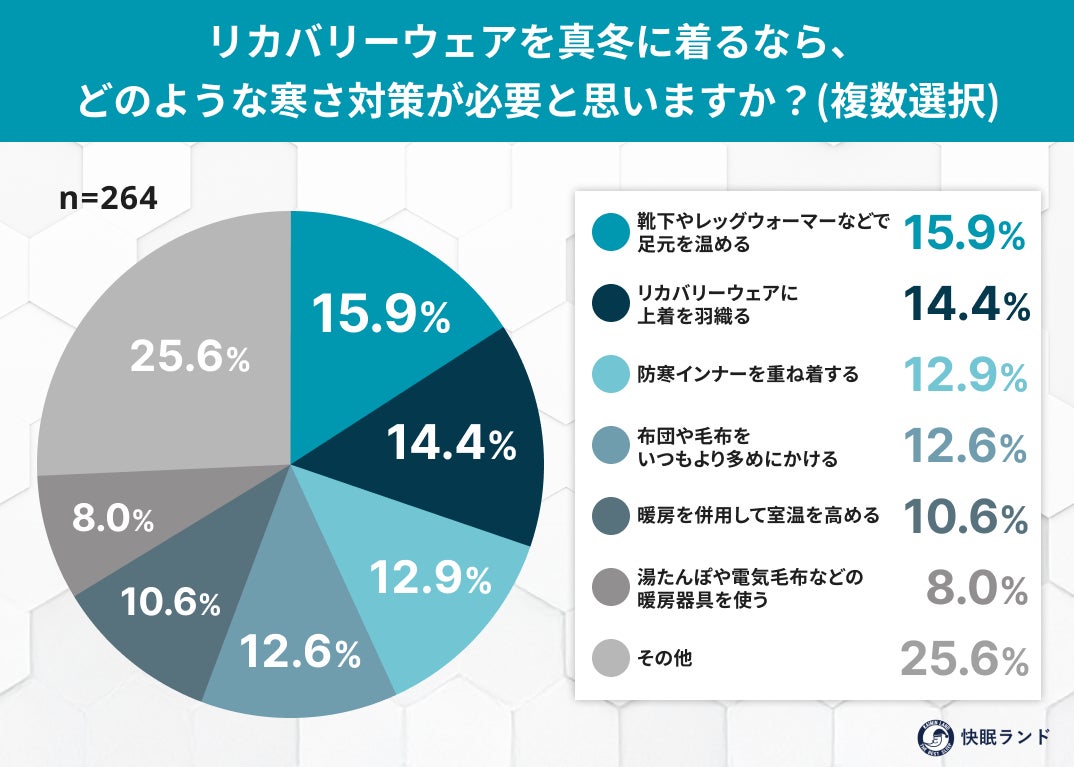 その他:25.6%(冬用のリカバリーウェアに変える:7.8%、寝る前にお風呂でしっかり温まる:7.7%、寝る前に温かい飲み物を飲む:4.6%、体温を上げるためストレッチや軽い運動をする:4.1%、特に工夫せず、現状で問題ない:1.4%)