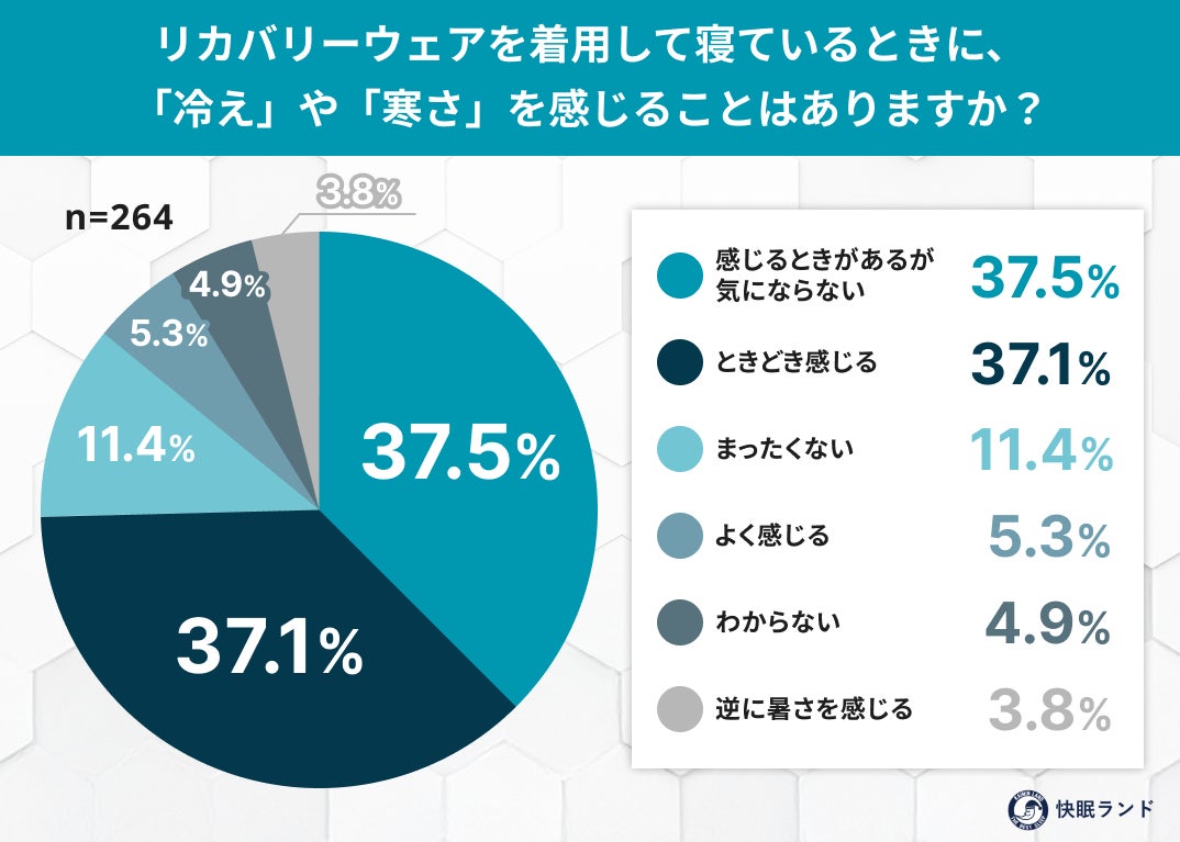 寒さが深まり、夜間の冷え込みが気になる季節。寝つきの悪化や冷えによる中途覚醒など、「冬の睡眠トラブル」が増える時期でもあります。近年、就寝時のコンディショニング目的で着用される“リカバリーウェア”が、冬の新たな“あったかアイテム”として注目されつつあります。そこで「快眠ランド」を運営する「ムーンムーン株式会社」では、リカバリーウェアを利用したことがある全国の男女264人を対象に、「冬の着用実態」についてアンケート調査を実施しました。調査の結果、着用による体感温度の変化や寒さ対策の傾向、冬用モデルへの需要など、冬の睡眠環境をめぐる実態が明らかになりました。