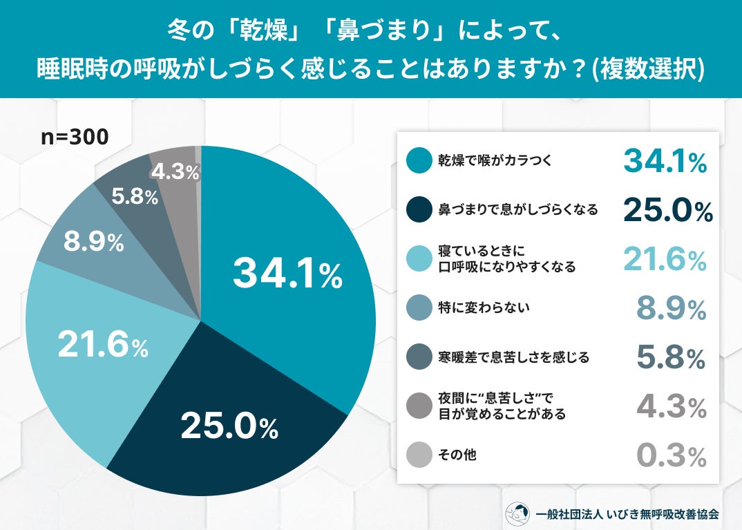 • 冬の乾燥・鼻づまりによる呼吸への影響は「乾燥で喉がカラつく」が最多(34.1%)