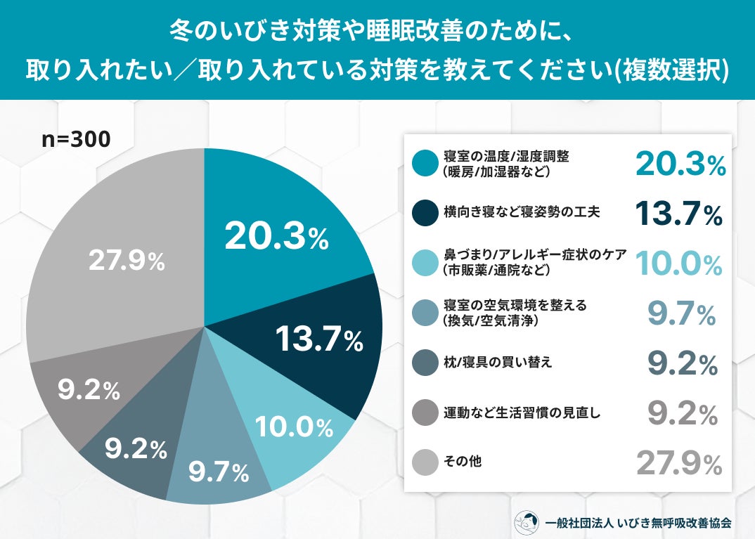 • その他:27.9%(スマホ時間を減らす:9.1%、特に対策していない:8.8%、鼻呼吸テープ:4.2%、飲酒を控える:2.9%、無呼吸検査:2.0%、その他:0.9%)