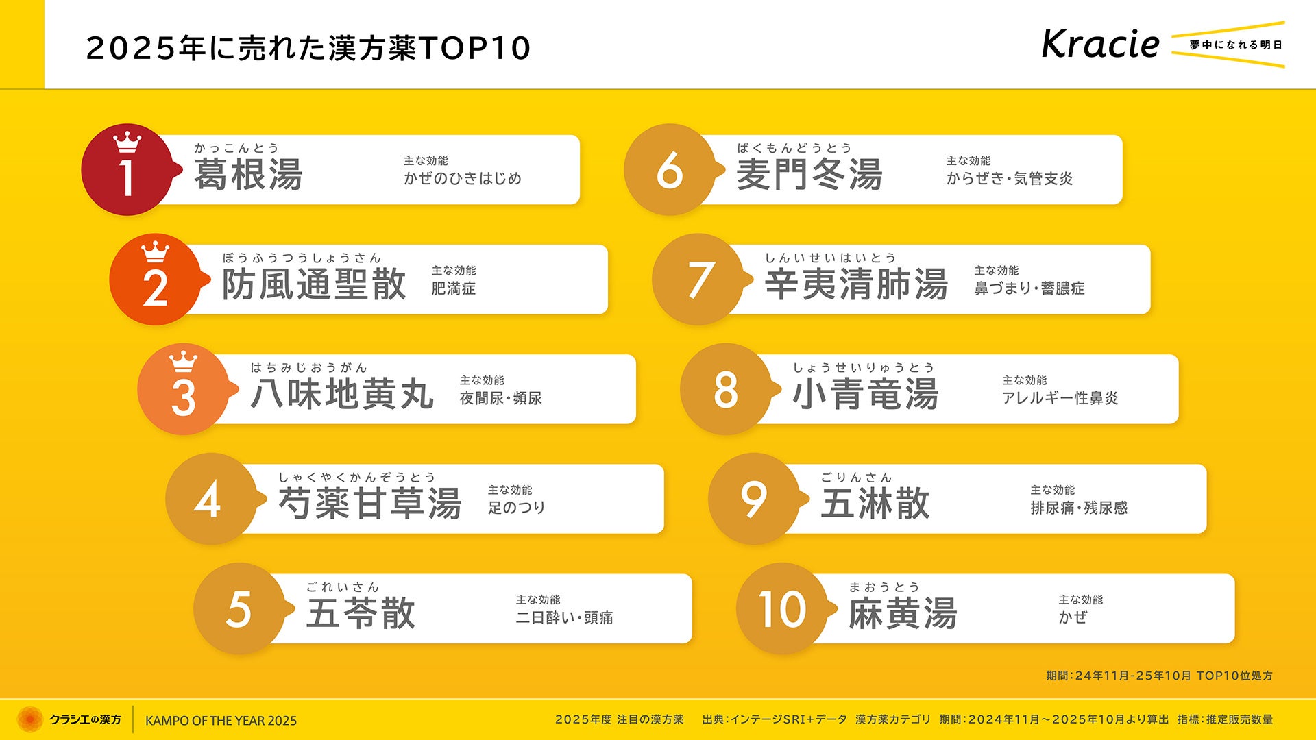 漢方薬を中心とした一般用医薬品と医療用医薬品を販売するクラシエ薬品株式会社は、漢方薬市場の動向や、2025年に売上を伸ばした注目の漢方薬をまとめた「KAMPO OF THE YEAR 2025」を、12月4日(木)に発表しました。