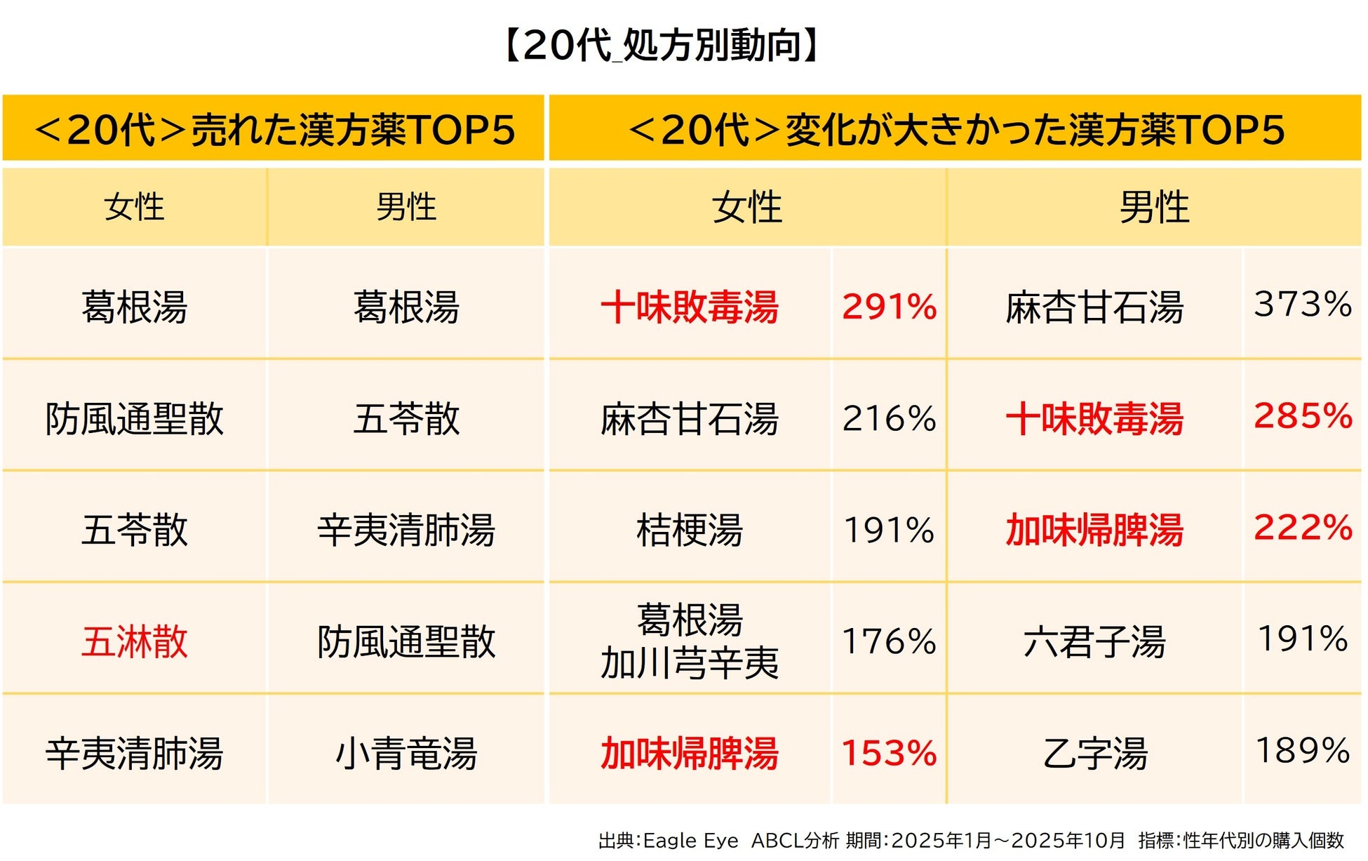 今季は、SNSで注目を集めた漢方薬として、ニキビや湿疹などに用いられる『十味敗毒湯』と、不眠やストレスなどによる精神不安の改善に用いられる『加味帰脾湯(かみきひとう)』が大きく伸長しました。特に20代を中心に需要が拡大しており、若年層での漢方薬への関心の高まりがうかがえます。