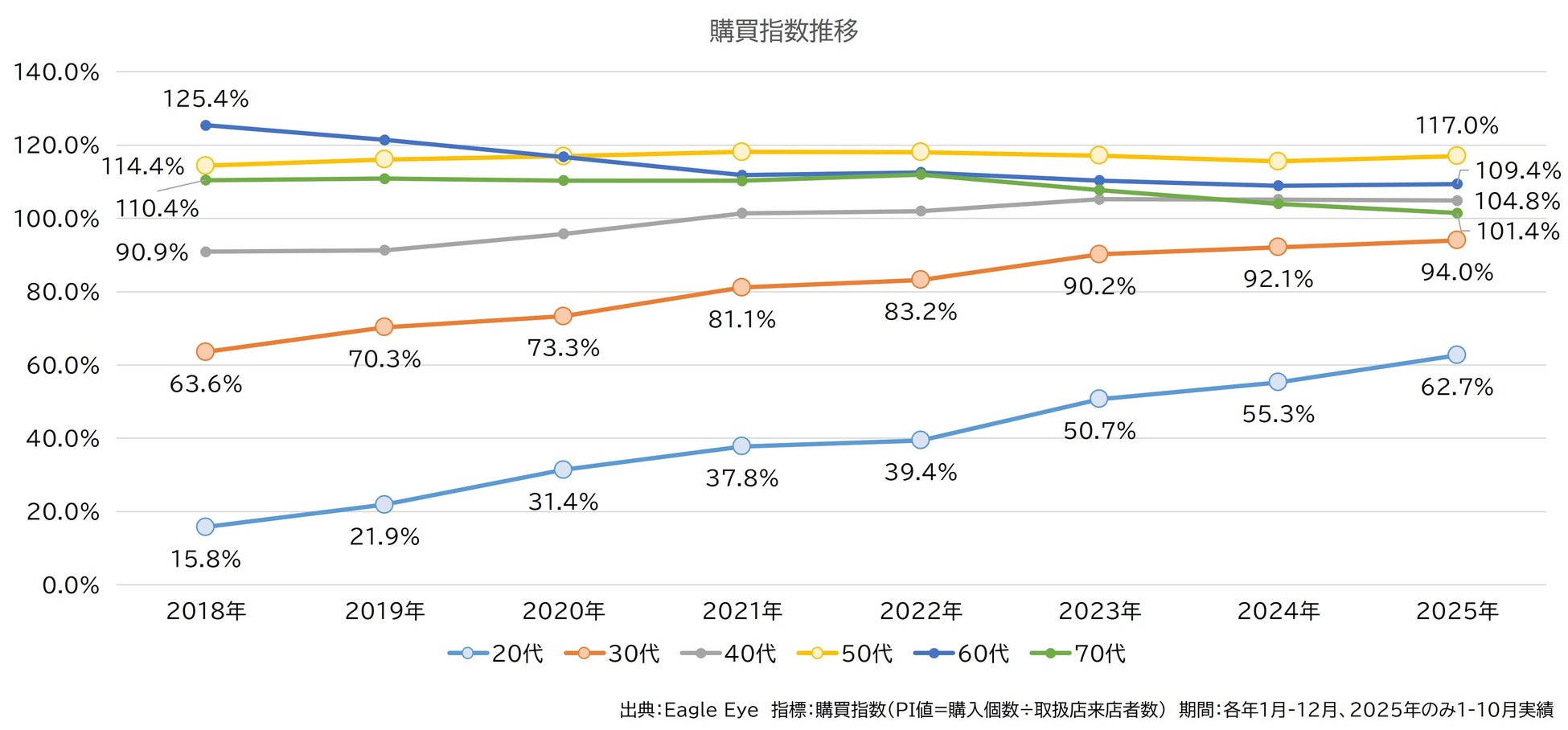 一般用漢方薬市場において購入個数と来店者数を基に算出した購買指数の変遷を時系列でみると、直近7ヶ年で20代・30代の漢方薬需要に増加傾向が見られました。また、50代の中高年層では依然と高い値を示しています。この結果から、現代の漢方薬の主要ターゲットは若年層と中高年層であることが窺えます。