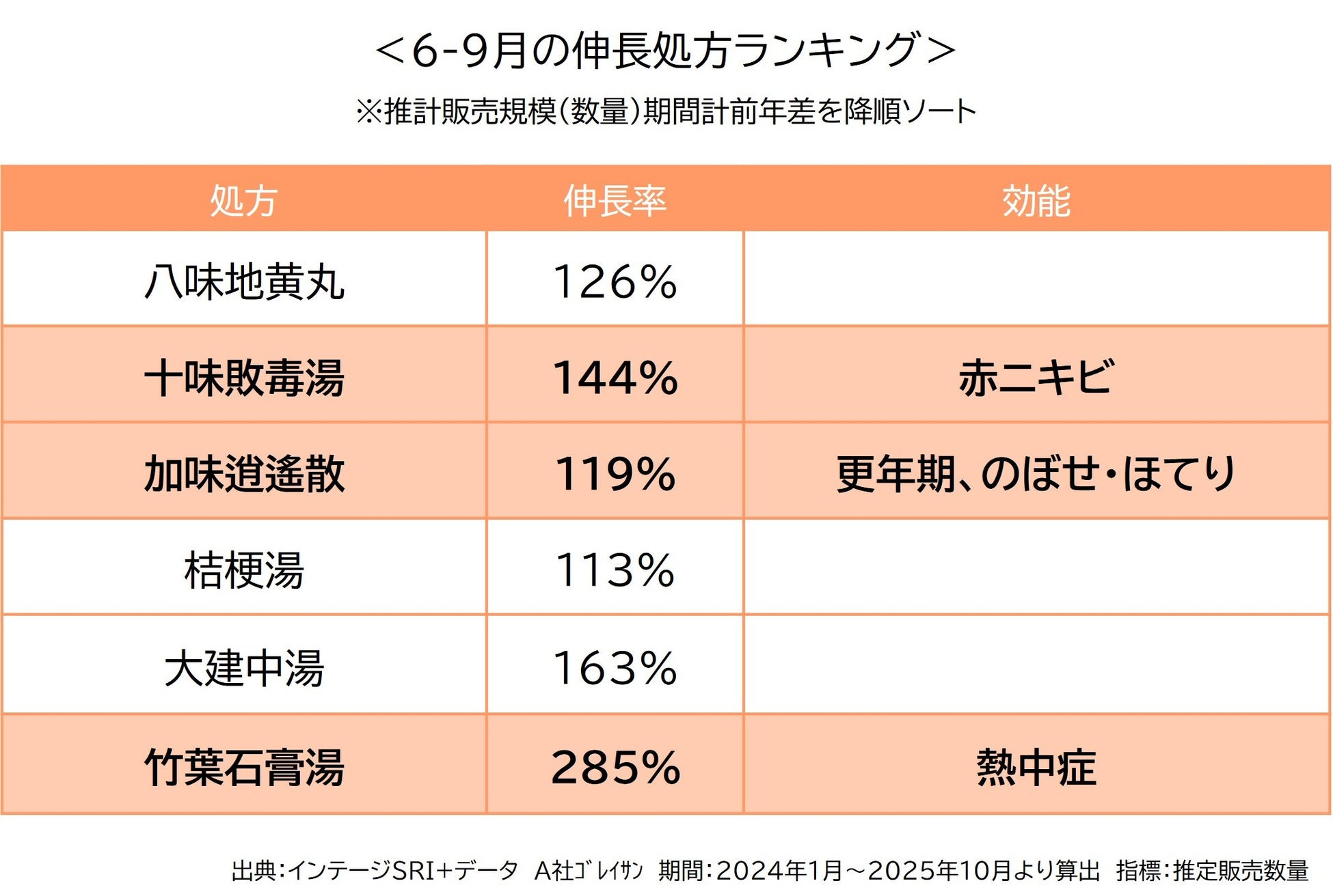 さらに、例年は8月に最盛期を迎える『十味敗毒湯』が、SNSでの反響を受け、今年は6月頃に月別販売規模がピークに達しました。その後も高い販売水準が続き、例年以上の伸びを記録しました。今年は気温が高い期間が長く、さらに厳しい残暑が長引いたことが例年とは異なる販売規模に影響したと考えられます。