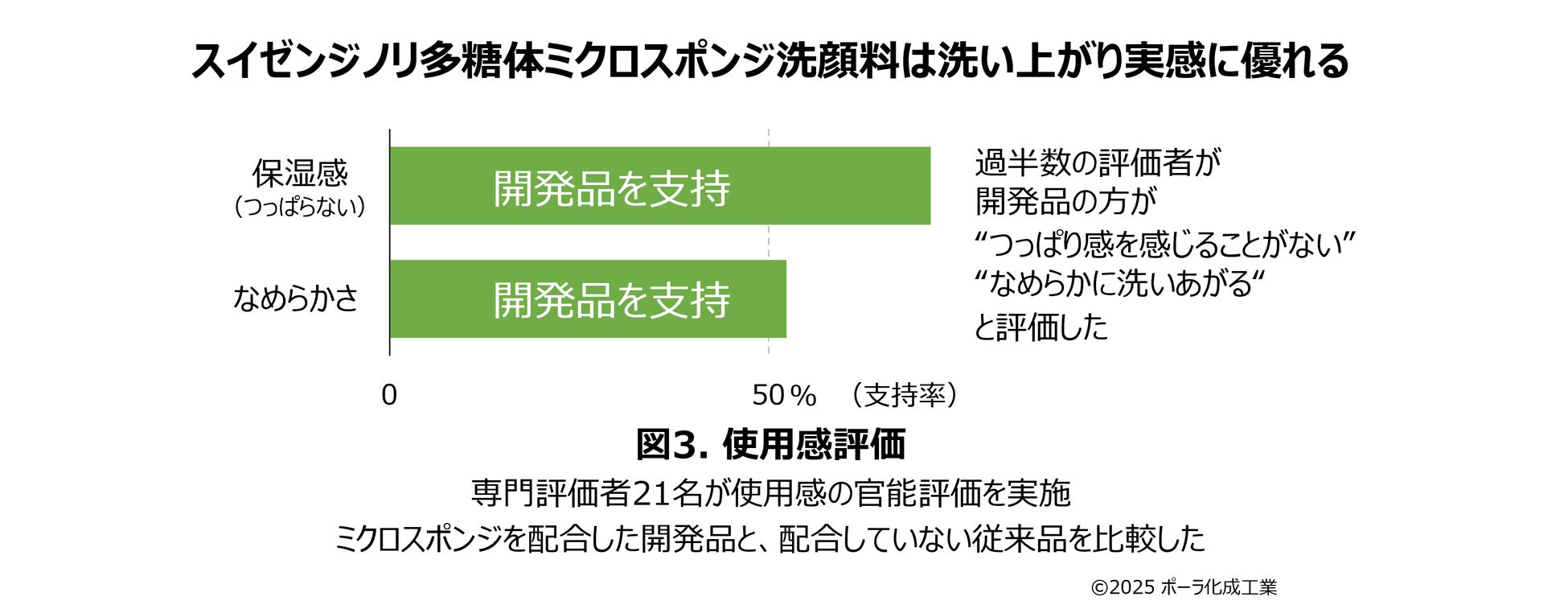 ポーラ化成工業では、TDCに導入した独自の高性能装置によりスイゼンジノリ多糖体を通常よりも高速で分散処理することで、水中の繊維ネットワークをより細かく緻密にすることに成功。これにより、皮脂に見立てた油分をしっかりキャッチすることができるようになりました(補足資料3)。またこれを配合した洗顔料は、官能評価で洗い上がりの良さを支持する割合が高いことが確認されました(図3)。これはスイゼンジノリのきめ細かい繊維ネットワークがミクロのスポンジとしてうるおいを守りながらやさしく汚れをキャッチしてくれている作用だと考えられます。