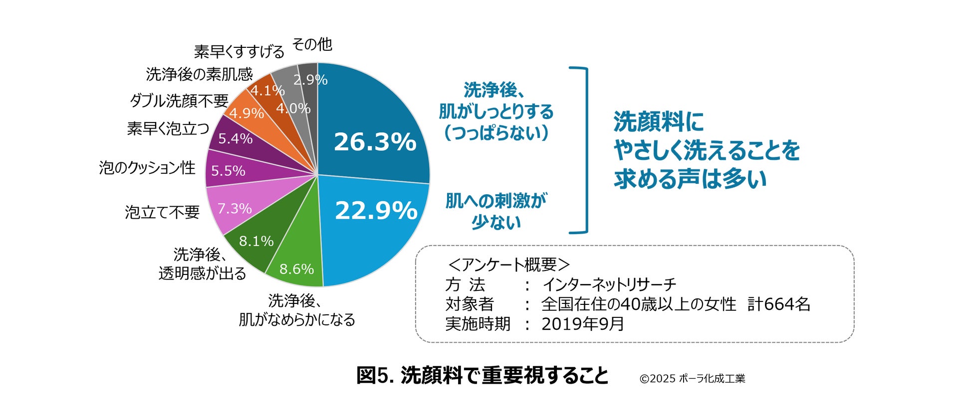 一般消費者を対象に実施した洗顔料に関する自社アンケート調査では、洗顔料に対し、泡質や後肌実感などの機能面に加え、肌への刺激が少ないことを望む方が多いことが確認されました(図5)。