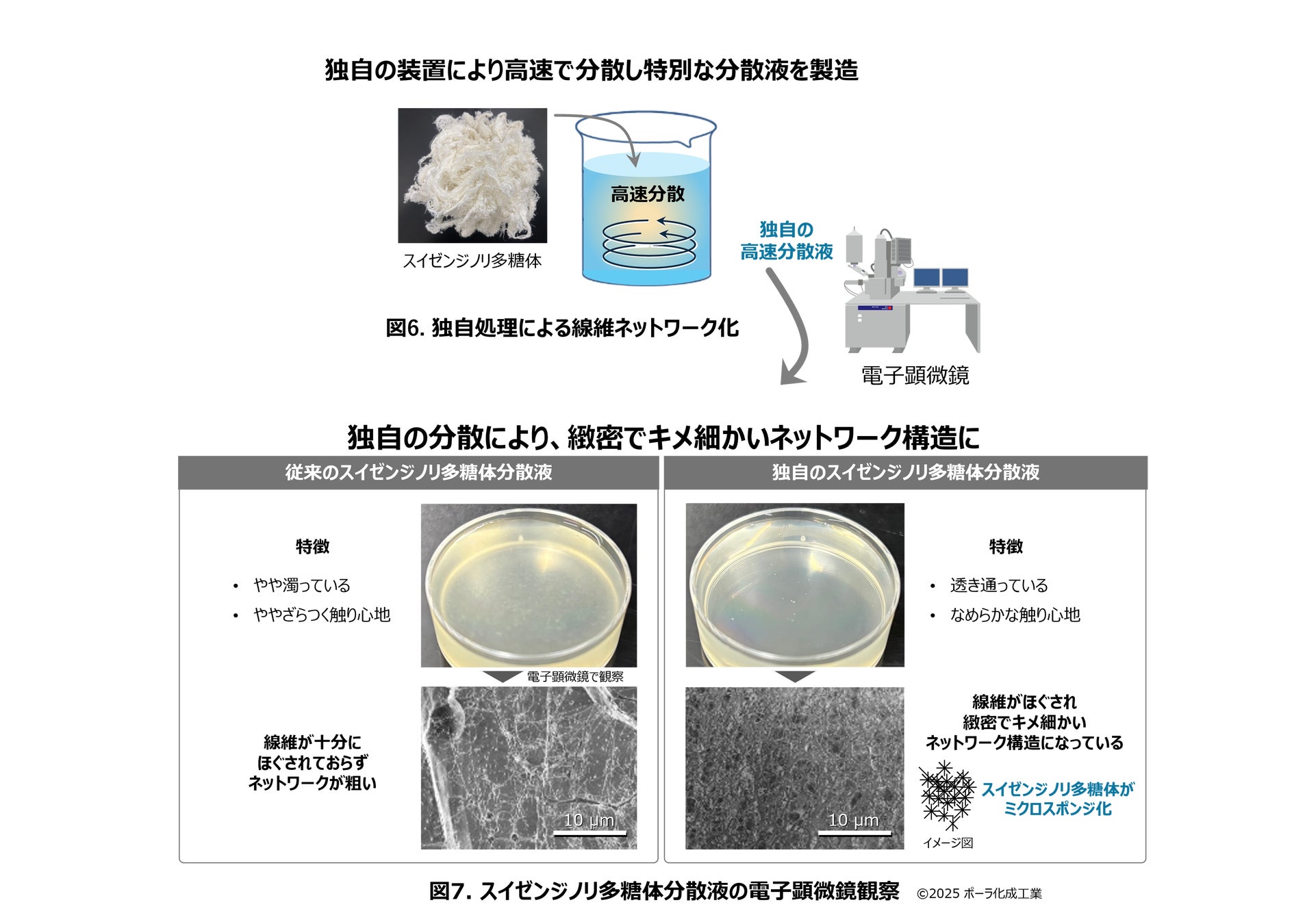 スイゼンジノリ多糖体を水に溶かし、TDCに導入した独自の新装置により、超高速で分散処理を行いました(図6)。電子顕微鏡で観察すると、従来の分散速度と比べて、微細で緻密な繊維ネットワーク構造に変化していることが確認されました(図7)。