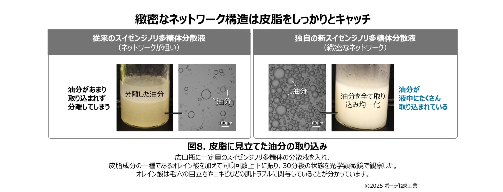 皮脂に見立てた油分をキャッチする能力をテストした結果、独自の分散液では油分をたくさん抱え込むことが確認されました(図8)。