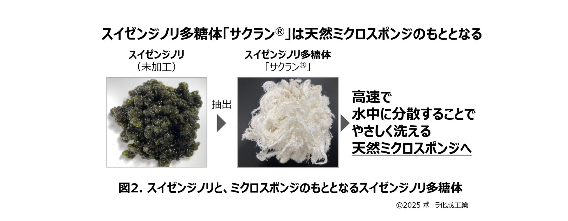 熊本阿蘇地域に生息する日本固有の淡水性ラン藻「水前寺海苔(スイゼンジノリ)」からは、「サクランⓇ」と呼ばれる多糖体(図2)が抽出できます。分子量は2900万にも上り、化粧品に使われる高分子多糖原料の中でも極めて大きく、ふわふわとしたやわらかなボディスポンジのようです。水に溶かすととろみが出て、水分を多く保持できるため、保湿剤としても活用されています。