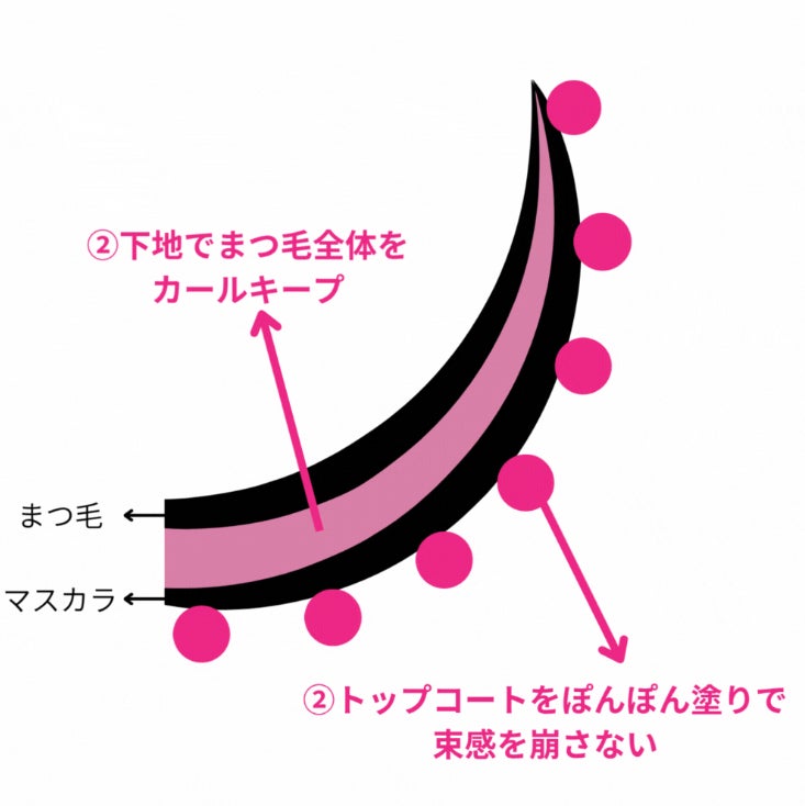 上向きカールを形状記憶する“まつ毛キープ剤”をマスカラ下地とトップコートのダブル使いすることでメイク仕立ての仕上がりを強力キープ。マスカラの色を邪魔をしない透明色。まつ毛のカールを下げずに、マスカラもにじませません。