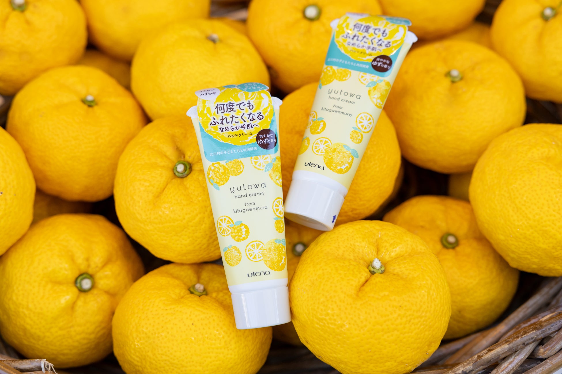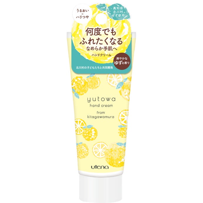 パッケージのゆずのモチーフは、子どもたちが「ちぎり絵」で作成。「村の誇りである“ゆず”を通して、北川村のことを知ってほしい!」という熱い想いをもった、高知県北川村の子どもたちと化粧品メーカーのウテナ、ドラッグストアのウエルシアグループとの共同開発商品です。