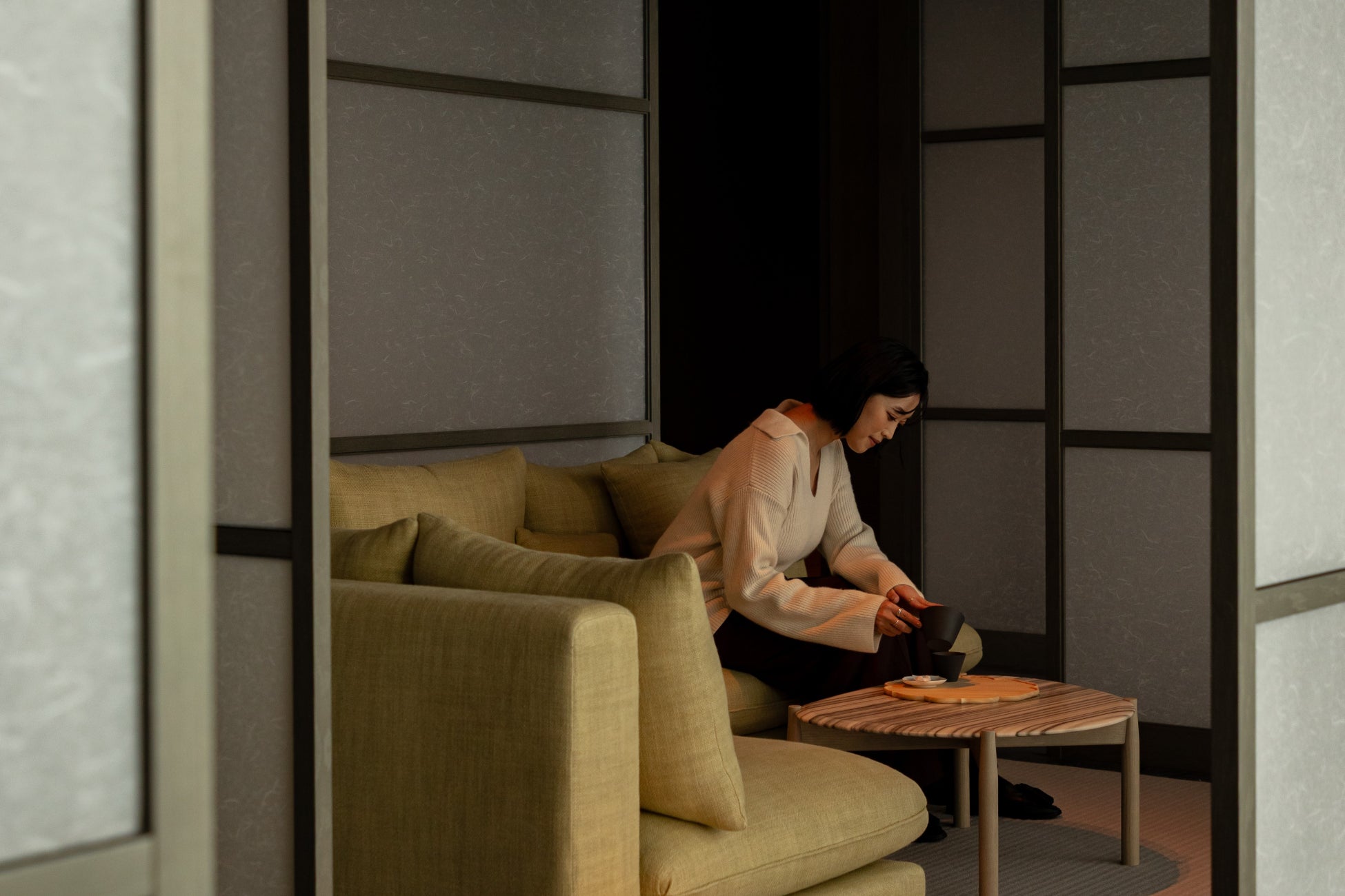 30階のロビーの一角には、JWマリオット・ホテル東京のマインドフルネスの哲学を体現する瞑想ルーム「セリーンスペース(Serene Space)」は、色、音楽、香りが織りなす心安らぐ空間として、慌ただしい日常から離れ、ゲストが心を静め、自分自身と向き合うための安息のひとときをお届けします。